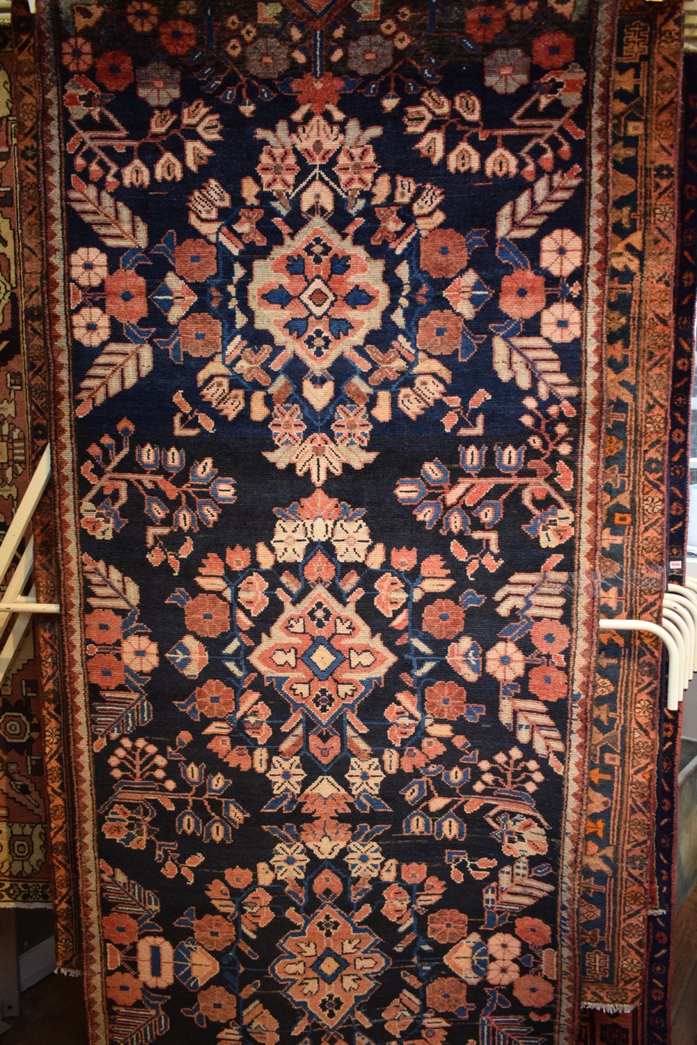 A STUNNING TRIBAL CIRCA 1960'S PERSIAN BAKHTIAR ARMANIBAFT RUNNER. 100% HANDSPUN WOOL & NATURAL DYES. DENSE PILE. HAND-WOVEN BY ARMENIAN WEAVERS OF CHAHARMAHAL VA BAKHTIARI.ALL OVER FLORAL PATTERNS IN PEACH, CREAM AND BLUE ON A CHARCOAL BACKGROUND. IN GOOD CONDITION. CERTIFICATE OF AUTHENTICITY INCLUDED. SIZE: 325X107CM ORIGIN: PERSIA - RRP: $3,200