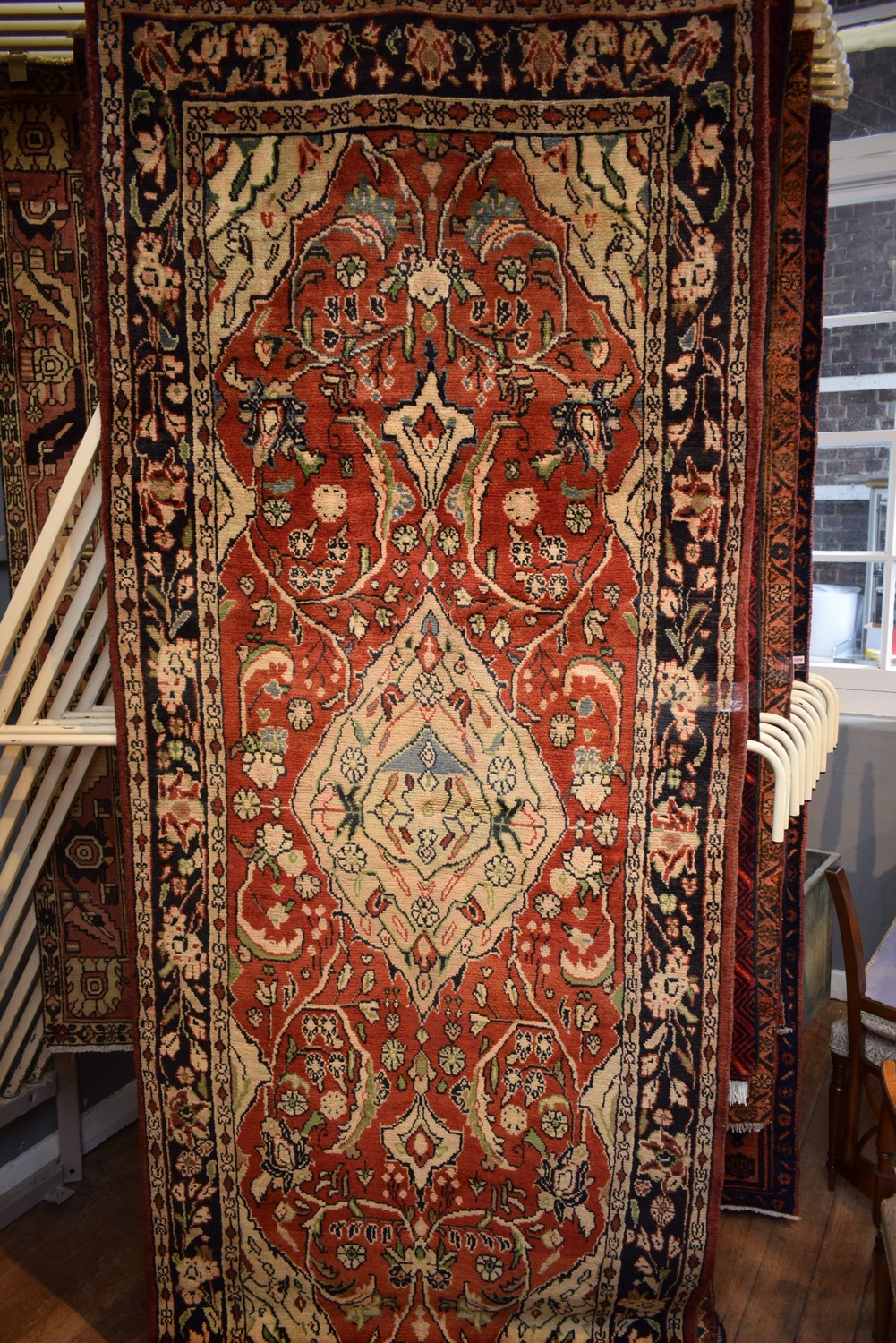 A SOLID & DURABLE PERSIAN MEHRABAN HALL RUNNER. 100% HAND SPUN WOOL. DENSE PILE. HAND-KNOTTED VILLAGE WEAVE WITH TRADITIONAL DESIGN OF ELONGATED FLORAL MEDALLION IN A RED FIELD OF FLORAL SPRAYS. BORDER OF FLORAL PATTERNS IN ROYAL BLUE. CERTIFICATE OF AUTHENTICITY INCLUDED. SIZE: 270X106CM ORIGIN: PERSIA - RRP: $2,100