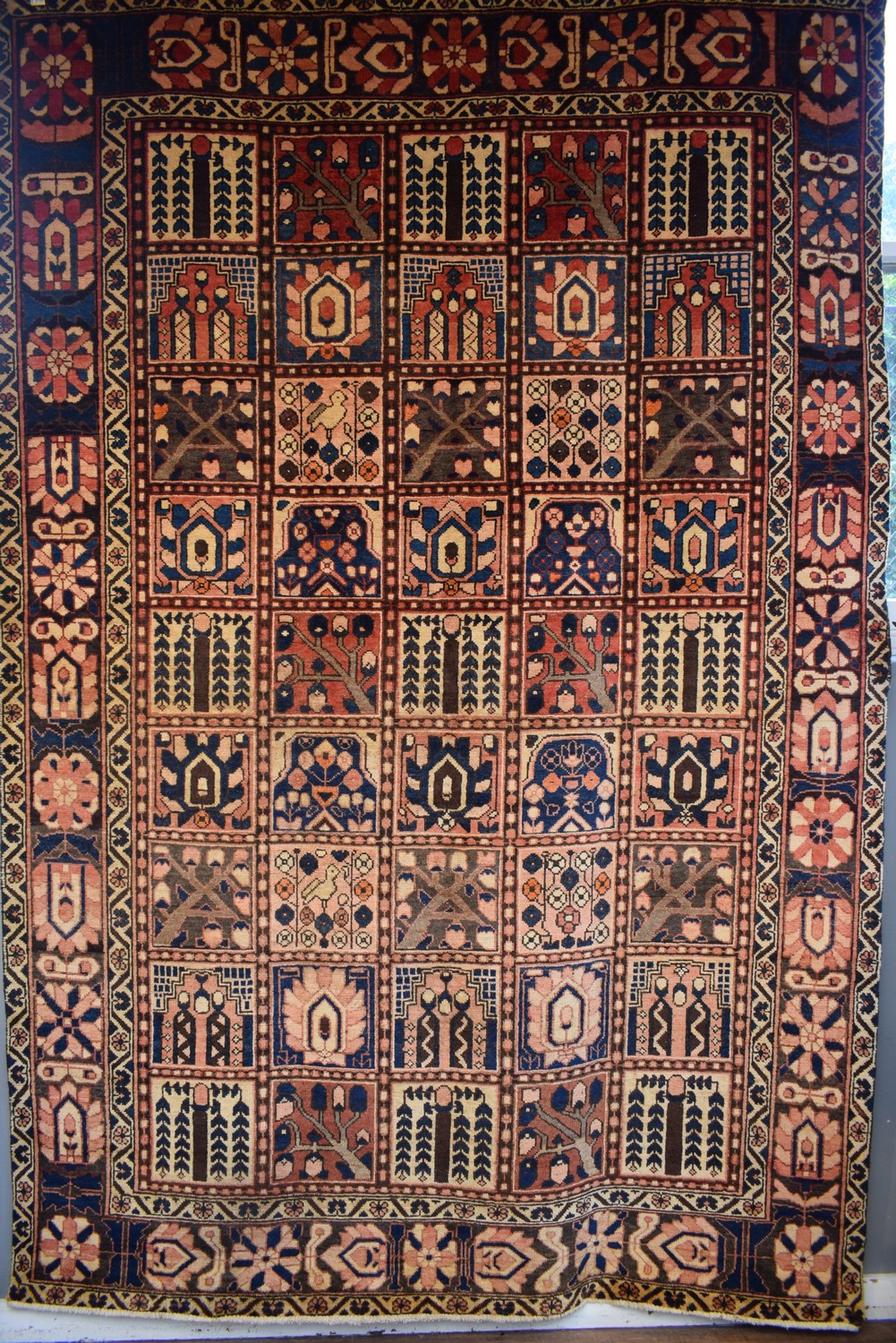 A PERSIAN CIRCA 1970'S BAKHTIAR RUG. 100% WOOL. HARD WEARING, NATURAL DYES, SOLID & DENSE, IN EXCELLENT CONDITION. HAND-KNOTTED TRIBAL BAKHTIARI WEAVE WITH TRADITIONAL "GARDEN" DESIGN WITH PANELS CONTAINING GARDEN THEMES OF WILLOW TREES, FLORAL SHRUBS, PALMETTES AND PRAYER NICHES. BORDER OF PALMETTES & TENDRILS. SIZE: 310X208CM CERTIFICATE OF AUTHENTICITY INCLUDED. ORIGIN: PERSIA - RRP: $3,600