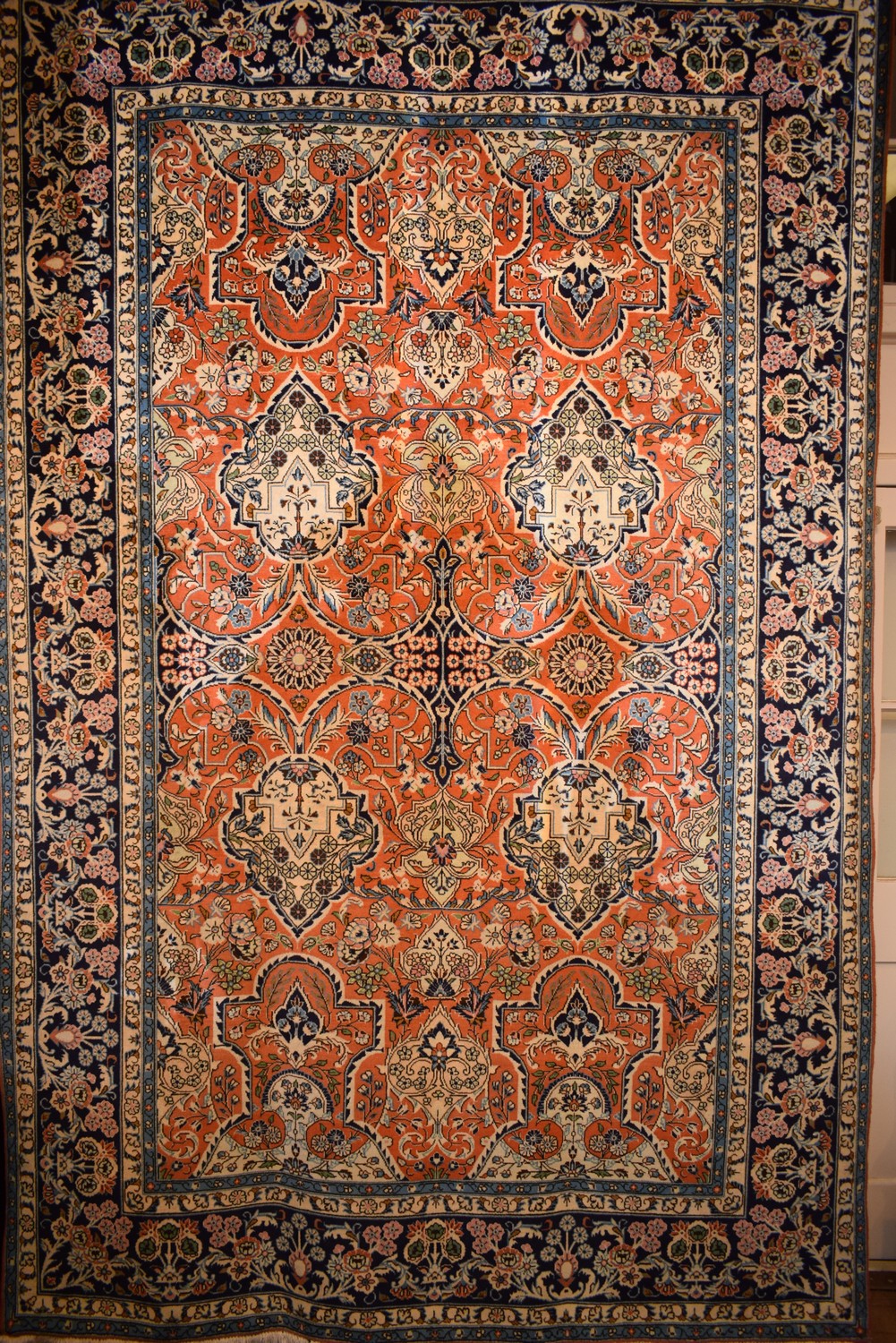 A STUNNING RARE FINE PERSIAN SAROUQ CARPET. 100% LAMBS (KORK) WOOL. DENSE PLUSH PILE. FINELY HAND KNOTTED CITY WEAVE WITH UNIQUE MINI MEHRAB DESIGNS AND MINI TREE OF LIFE. ALL OVER BEAUTIFUL FLORAL SPRAYS OF VARIOUS FLORAL FOLIAGE ALL SET ON A SOFT TERRACOTTA BACKGROUND WITH TONES OF BLUES, CREAM AND GREEN. EX-GALLERY EXHIBITED CARPET. IN PRISTINE CONDITION. CERTIFICATE OF AUTHENTICITY INCLUDED. SIZE: 300X195CM ORIGIN: PERSIA - RRP: $5,900