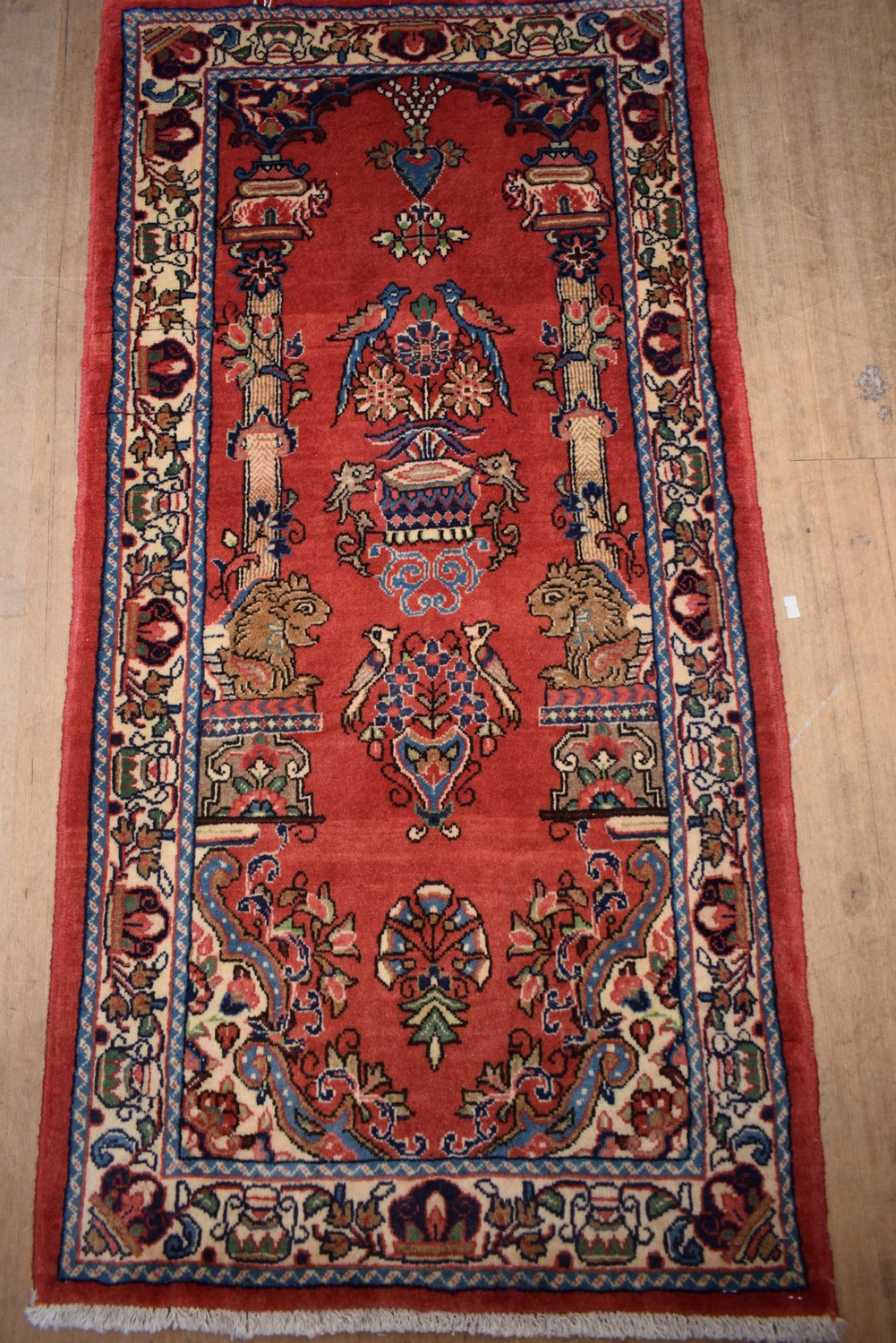 A FINE PERSIAN SAROUQ MEHRAB DESIGN RUG.FINE WOOL PILE. CLASSIC SAROUQ DESIGN CONTAINING PICTORIAL OF TREE OF LIFE DESIGN " DESIGN SYMBOLIZES THE BRIDGE GATEWAY TO PARADISE". A SYMBOLIC RUG WITH LIONS ON PILLARS, URNS AND BIRD LIFE. BORDER OF PALMETTES & SAZ LEAVES. SIZE: 132X68CM. CERTIFICATE OF AUTHENTICITY INCLUDED. ORIGIN: IRAN - RRP: $1,900
