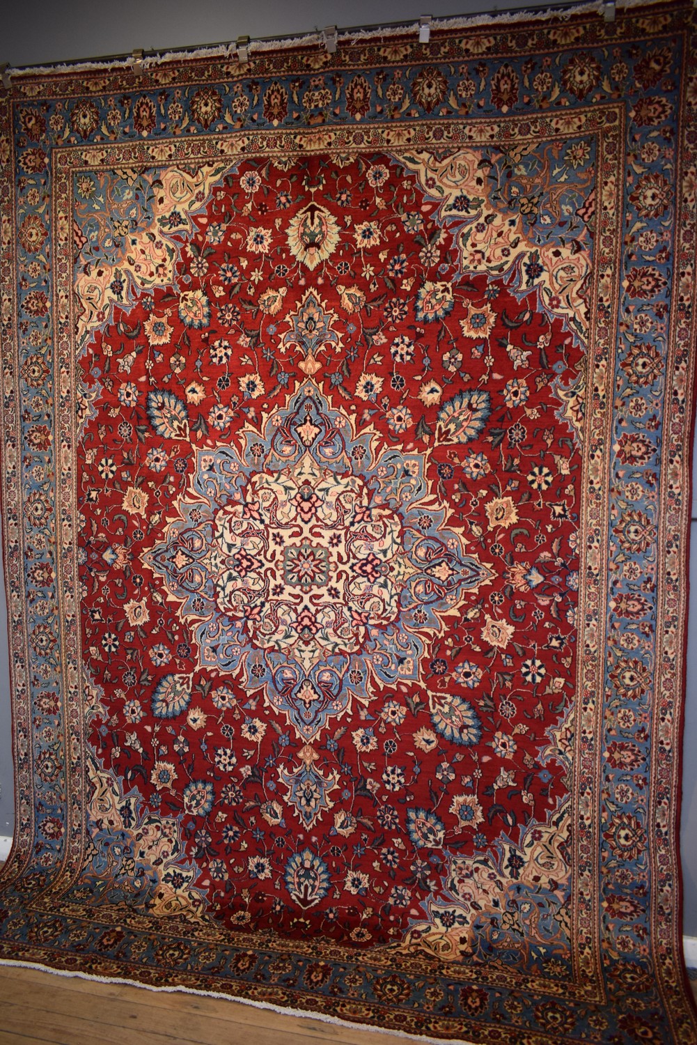 A FINELY HAND-KNOTTED CIRCA 1970'S PERSIAN MOOD CARPET, 100% WOOL. SOLID & DENSE VINTAGE PILE. CLASSIC MOOD DESIGN OF SUNBURST MEDALLION & QUARTERED CORNER MEDALLIONS IN A FIELD OF FLORAL HERATI MAHI PATTERNS. BORDER OF ROSETTES AND HERATI PATTERNS. IN PRISTINE CONDITION. SIZE: 363X260CM. CERTIFICATE OF AUTHENTICITY INCLUDED. ORIGIN: IRAN - RRP: $5,900