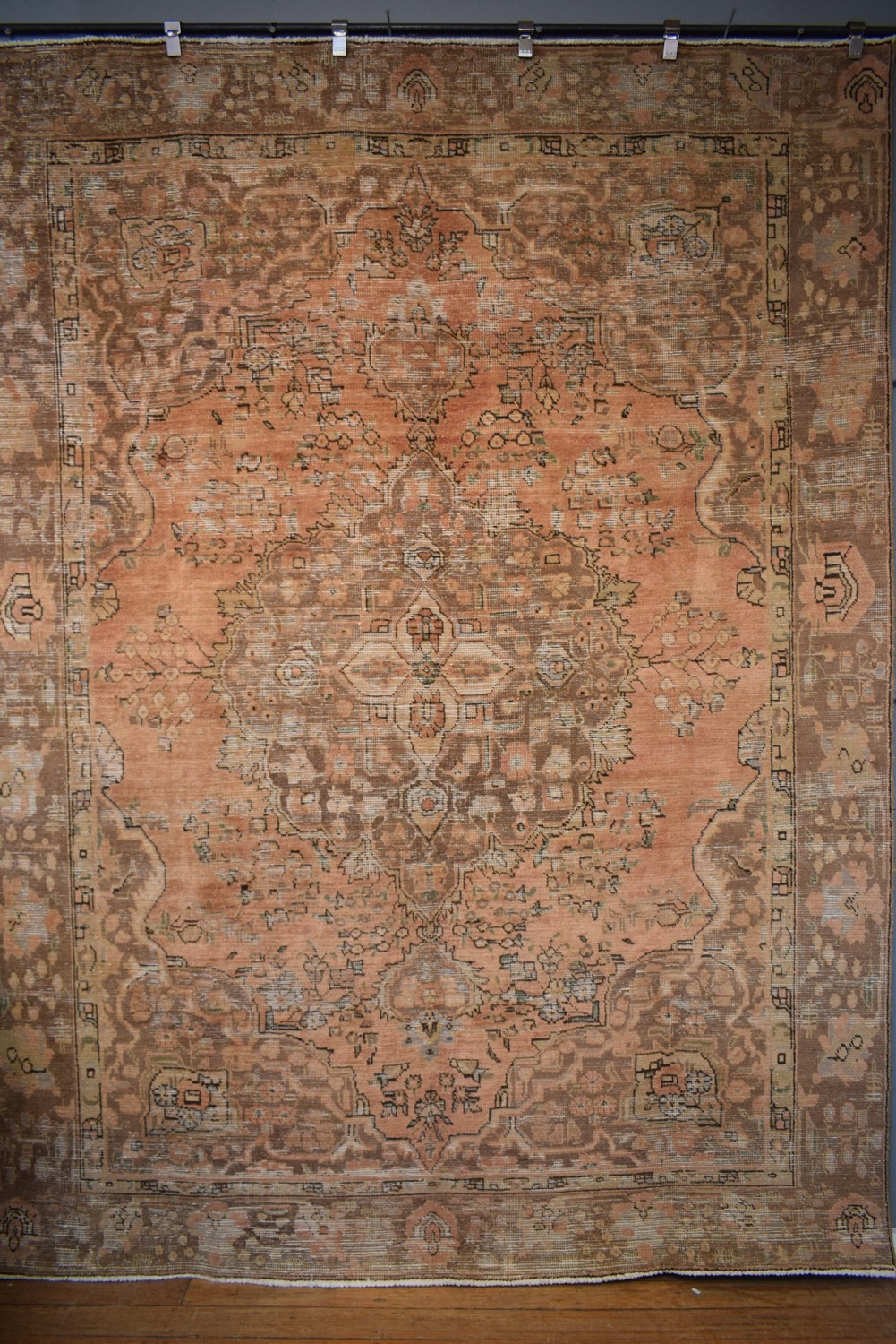 A CREATIVE VINTAGE OVER-DYED PERSIAN TABRIZ CARPET, VINTAGE PILE. A UNIQUE & INDIVIDUAL MODERN CARPET CREATED FROM AN AUTHENTIC HAND-KNOTTED WITH A TRADITIONAL CENTRAL MEDALLION, DESIGN VINTAGE PERSIAN TABRIZ CARPET. THE PILE IS SHORN AND THE ENTIRE IS OVER-DYED IN SOFT TERRACOTTA, TAN, BROWN &OLIVE. GALLERY EXHIBITED. CERTIFICATE OF AUTHENTICITY INCLUDED. SIZE: 312X233CM ORIGIN: PERSIA - RRP: $6,900
