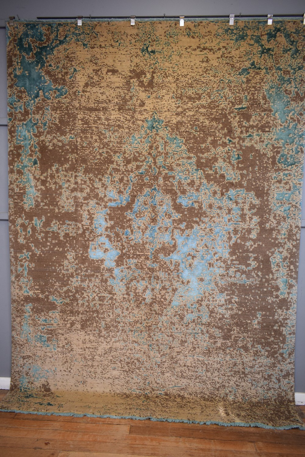 A LUSTROUS CONTEMPORARY BRANDNEW MODERN TRANSITIONAL RUG WITH MODERN TRANSITIONAL DESIGN OF ERASED AND EMBOSSED PATTERNS. FINELY HAND-LOOMED PLUSH WOOLLEN AND SILKY TEXTURE PILE. GALLERY DISPLAYED CARPET. THE ENTIRE IN TONNES OF TEAL, BEIGE & BROWN. IN PRISTINE CONDITION. ORIGIN: IRAN - RRP: $6,900 CERTIFICATE OF AUTHENTICITY SIZE: 341X244CM