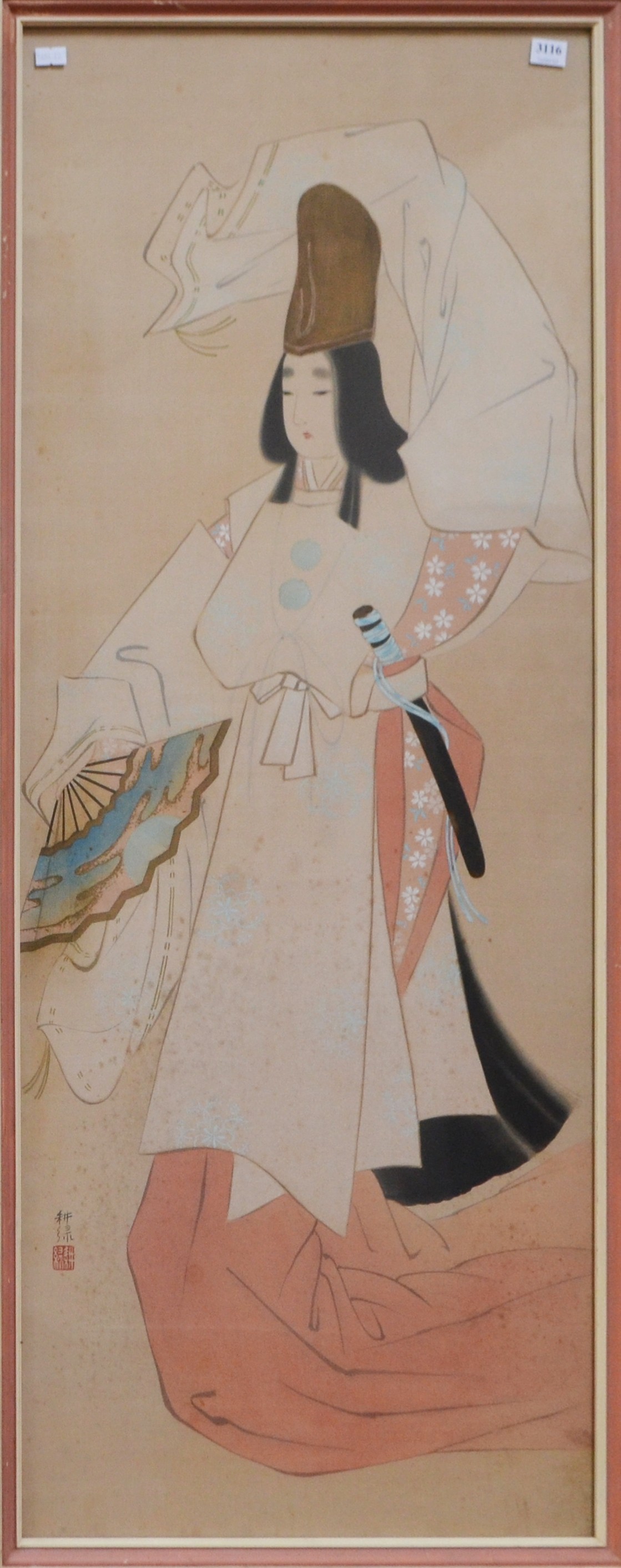 ARTIST UNKNOWN, JAPANESE GEISHA WORK ON FABRIC, 104 X 40CM, CONDITION: DISCLORATION AND SPOTTING THROUGHOUT BOTTOM HALF OF WORK