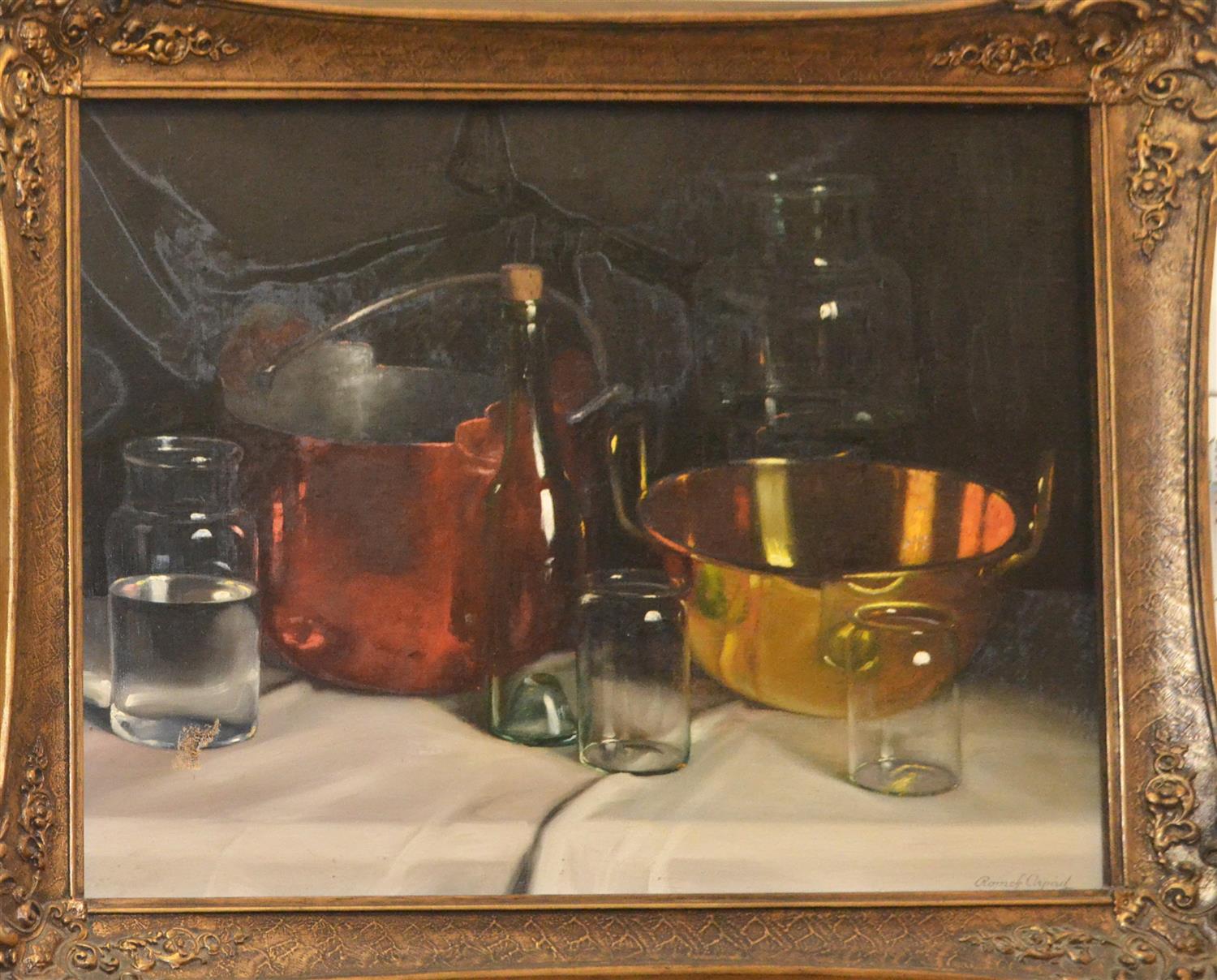 ROMEK ORPAD, JUGS, OIL ON CANVAS, 53 X 66CM, FRAME: 68 X 81CM, CONDITION: THIS ARTWORK IS IN FAIR CONDITION, THE IS A PUNCTURE TO THE CANVAS IN THE LOWER RIGHT HAND SIDE, APPROX. 3CM