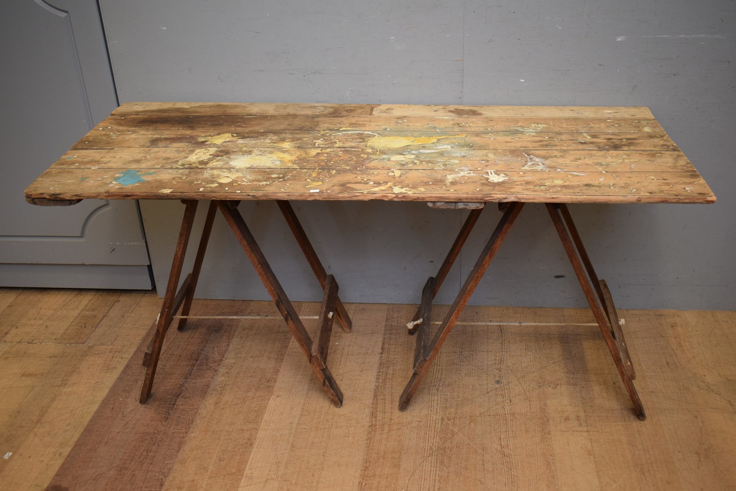1920S WOODEN TRESTLE TABLE ON ORIGINAL WOODEN FOLDING LEGS (A/F) (H79 X W170 X D73 CM) (LEONARD JOEL DELIVERY SIZE: LARGE)