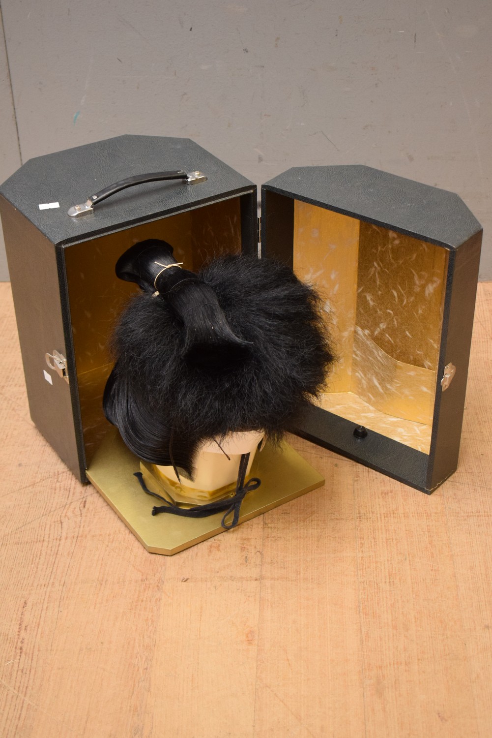 AN UNUSUAL 1920S ORIGINAL SUPERBLY MODELLED JAPANESE SUMO WIG IN NATURAL GREEN LEATHER CASE (H32 X W33 X D26 CM) (LEONARD JOEL DELIVERY SIZE: SMALL)