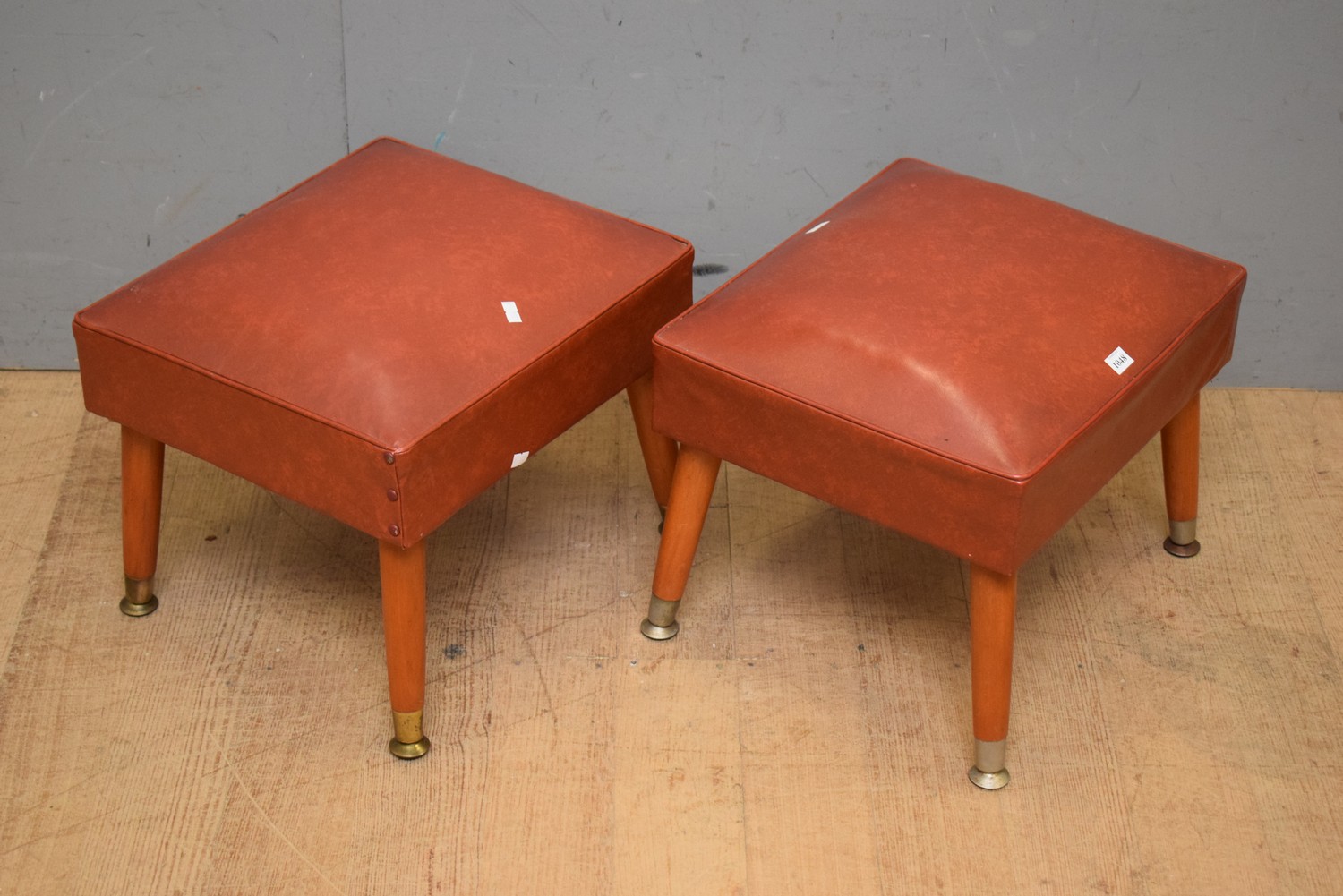 PAIR OF AUSTRALIAN MADE RETRO 1950S WOODEN LEG BURGUNDY VINYL FOOTSTOOLS (35H x 42W x 37D CM) (LEONARD JOEL DELIVERY SIZE: MEDIUM)