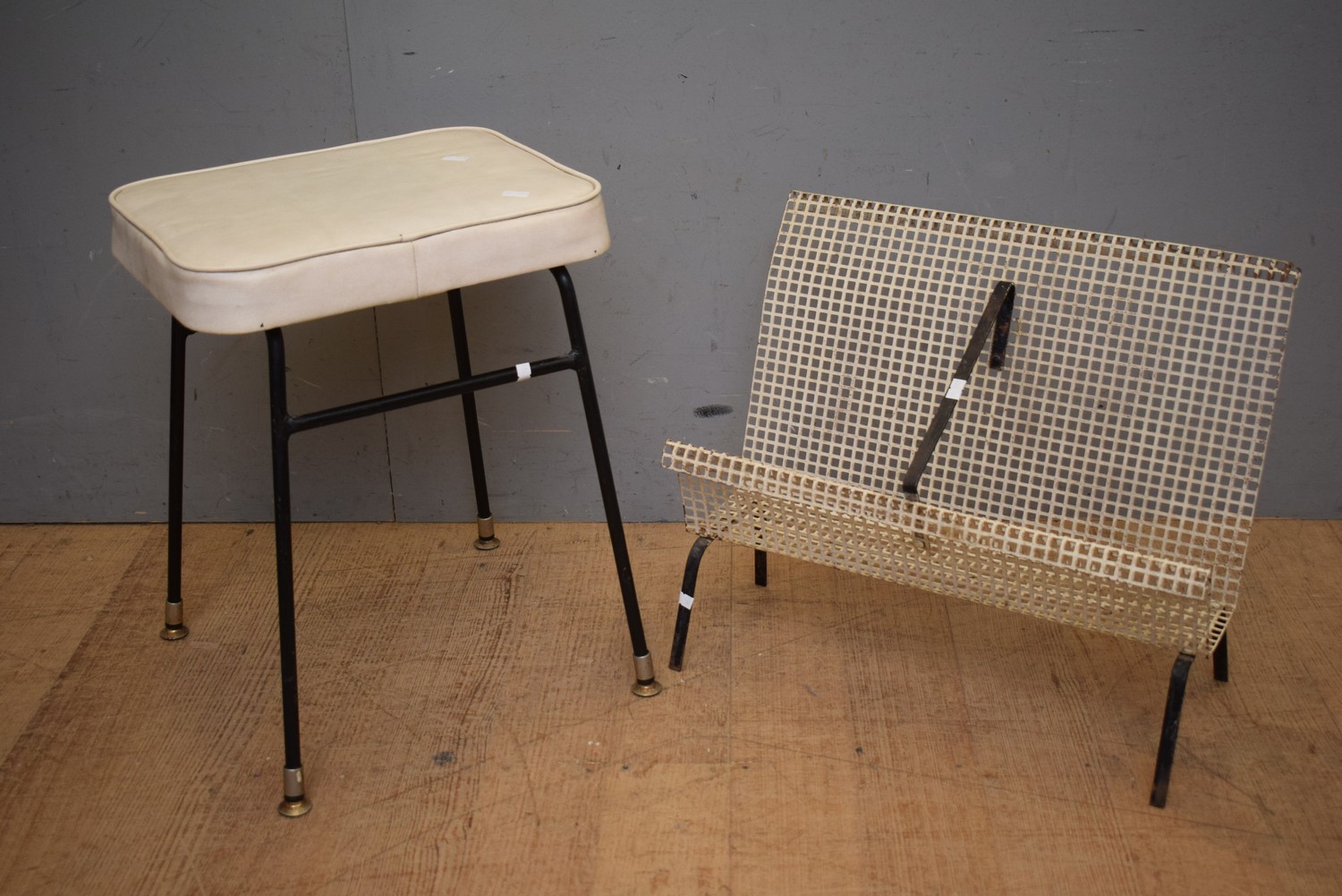 A 1950S RETRO AUSTRALIAN STEEL BASED VINYL STOOL AND BLACK AND WHITE RETRO 1950S WIRE MAGAZINE RACK (H47 X W39 X D30 CM) (LEONARD JOEL DELIVERY SIZE: MEDIUM)