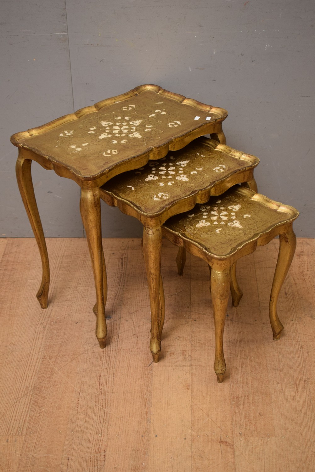 A NEST OF THREE ITALIAN GILTWOOD FLORENTINE TABLES WITH CREAM DETAILING (H58 X W56 X D35 CM) (LEONARD JOEL DELIVERY SIZE: MEDIUM)