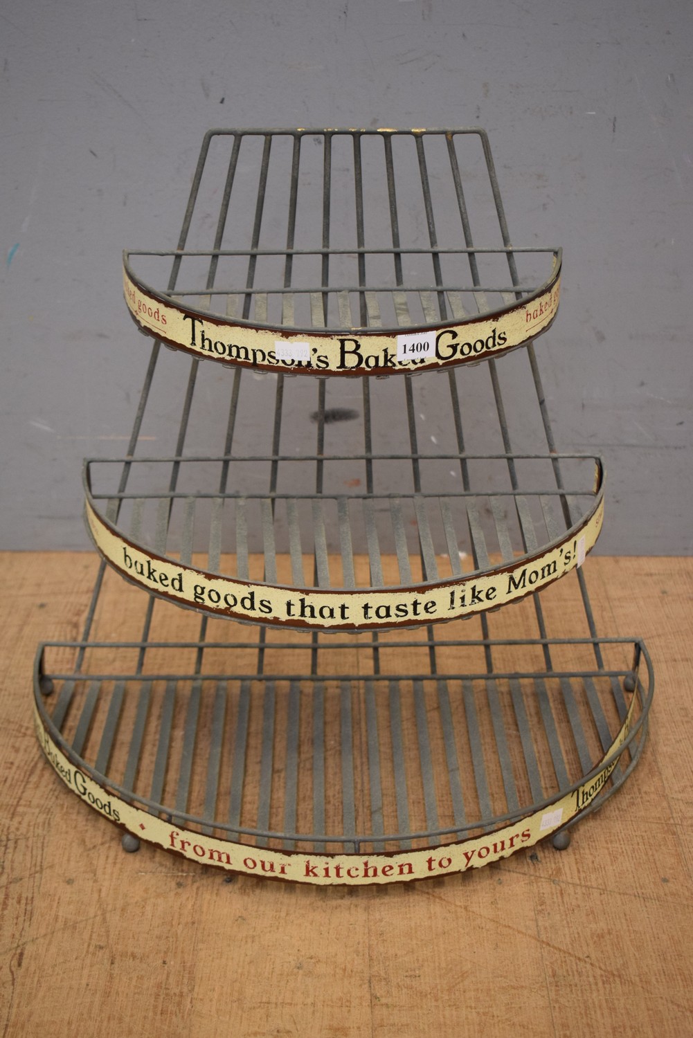 METAL AND ENAMEL THOMPSONS BAKED GOODS THREE TIER SHOP DISPLAY STAND (43H x 46W x 26D CM) (LEONARD JOEL DELIVERY SIZE: MEDIUM)
