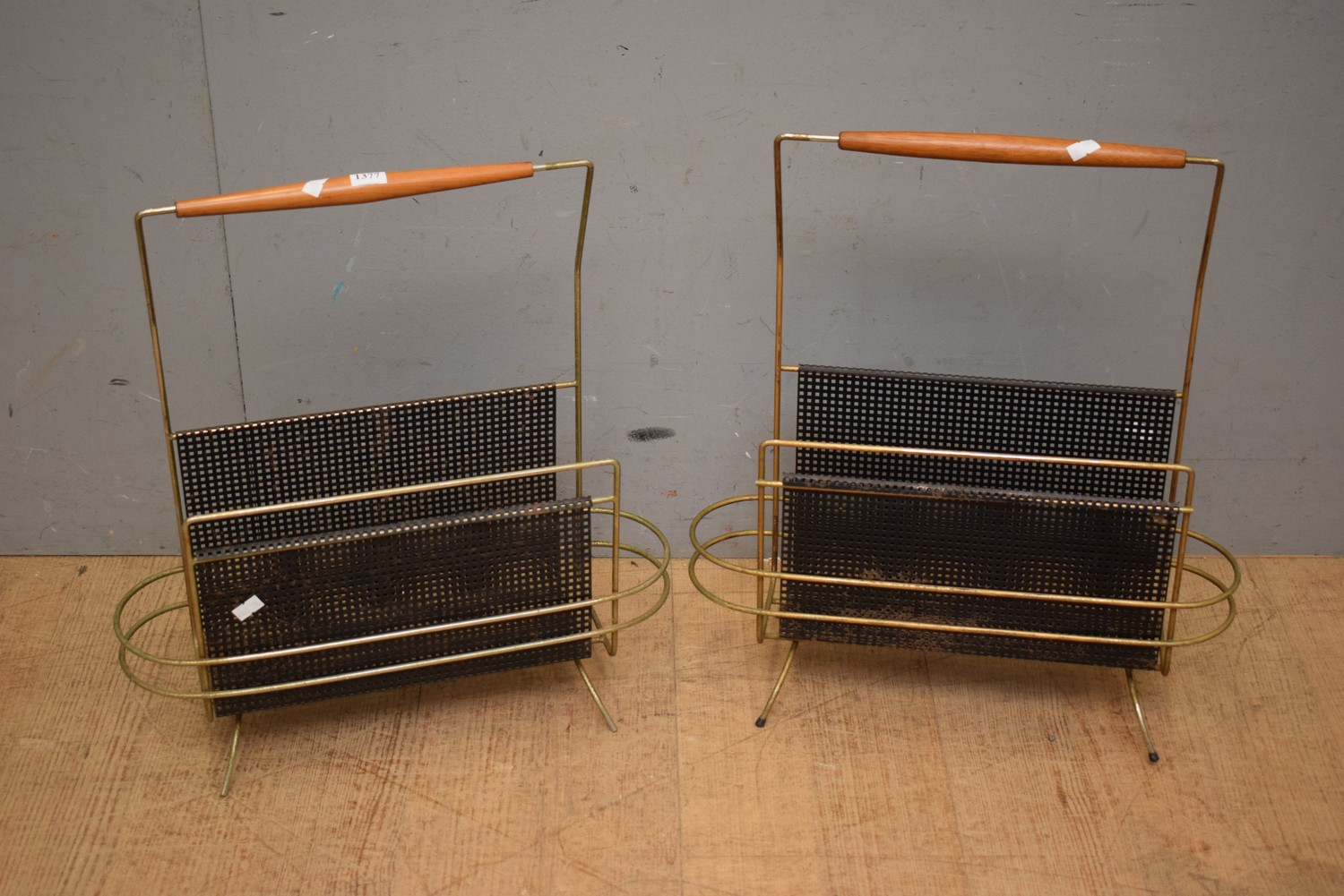 PAIR OF 1950S RETRO AUSTRALIAN MADE WIRE AND WOODEN MAGAZINE STANDS RACKS (49H x 43W x 13D CM) (LEONARD JOEL DELIVERY SIZE: MEDIUM)