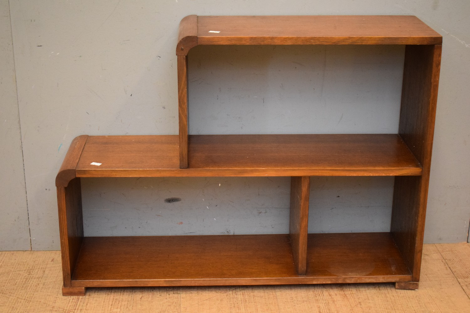AN AUSTRALIAN TWO TIER OAK WOODEN WATERFALL BOOKCASE (A/F) (H59 X W78 X D22 CM) (LEONARD JOEL DELIVERY SIZE: MEDIUM)