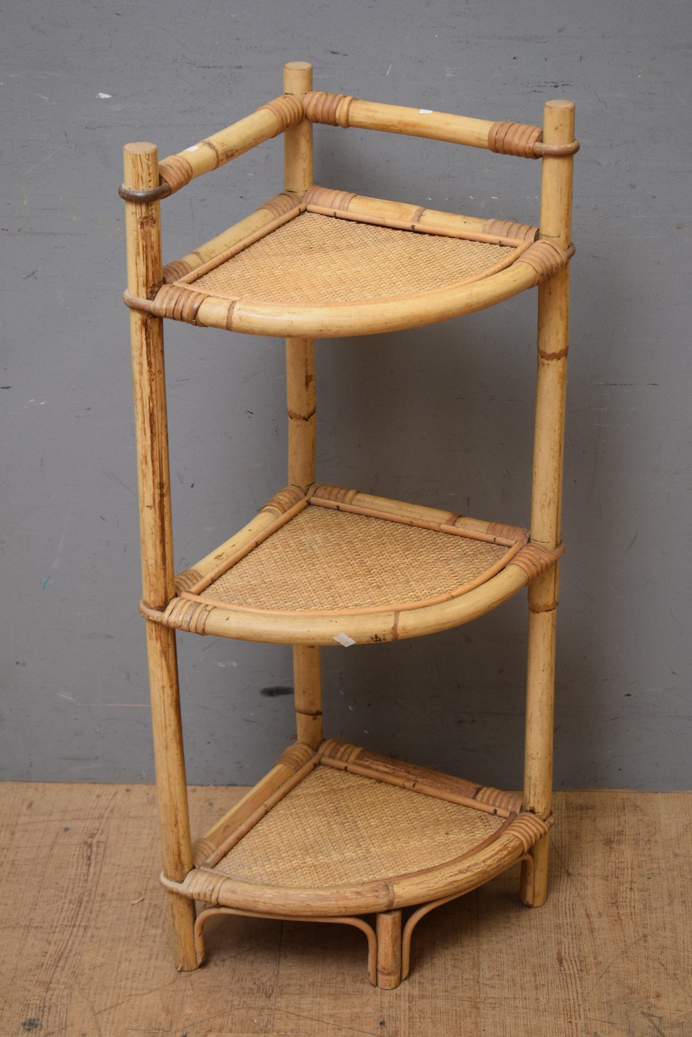 A RETRO 1950S THREE TIER CANE AND WOVEN RACK HAND CORNER WHAT NOT STAND (H92 CM) (LEONARD JOEL DELIVERY SIZE: MEDIUM)