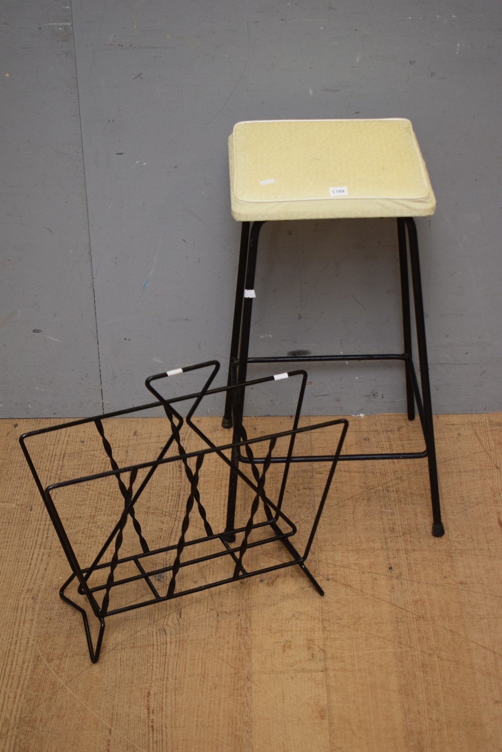 AN AUSTRALIAN MADE METAL FRAMED VINYL TOP STOOL AND BLACK METAL MAGAZINE RACK (61H x 32W xx 32D CM) (LEONARD JOEL DELIVERY SIZE: MEDIUM)