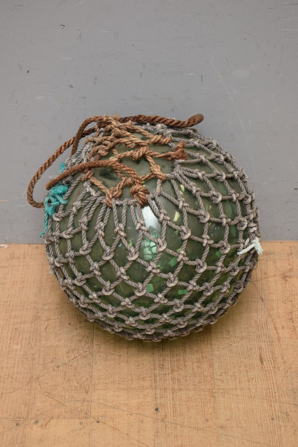 A GREEN GLASS AND NATURAL FIBRE SHIP FLOAT / FISHING BUOY (43D CM) (LEONARD JOEL DELIVERY SIZE: MEDIUM)