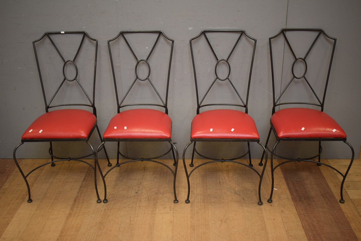 SET OF FOUR 1950S WROUGHT IRON FRAMED AND RED VINYL SEAT PATIO CHAIRS (H98 X W41 X D57 CM) (LEONARD JOEL DELIVERY SIZE: LARGE)