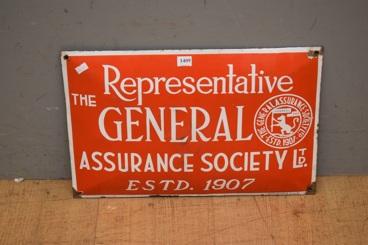 A CONVEX ENAMEL REPRESENTATIVE GENERAL INSURANCE SOCIETY SIGN - RED & WHITE (39H x 46W CM) (LEONARD JOEL DELIVERY SIZE: SMALL)