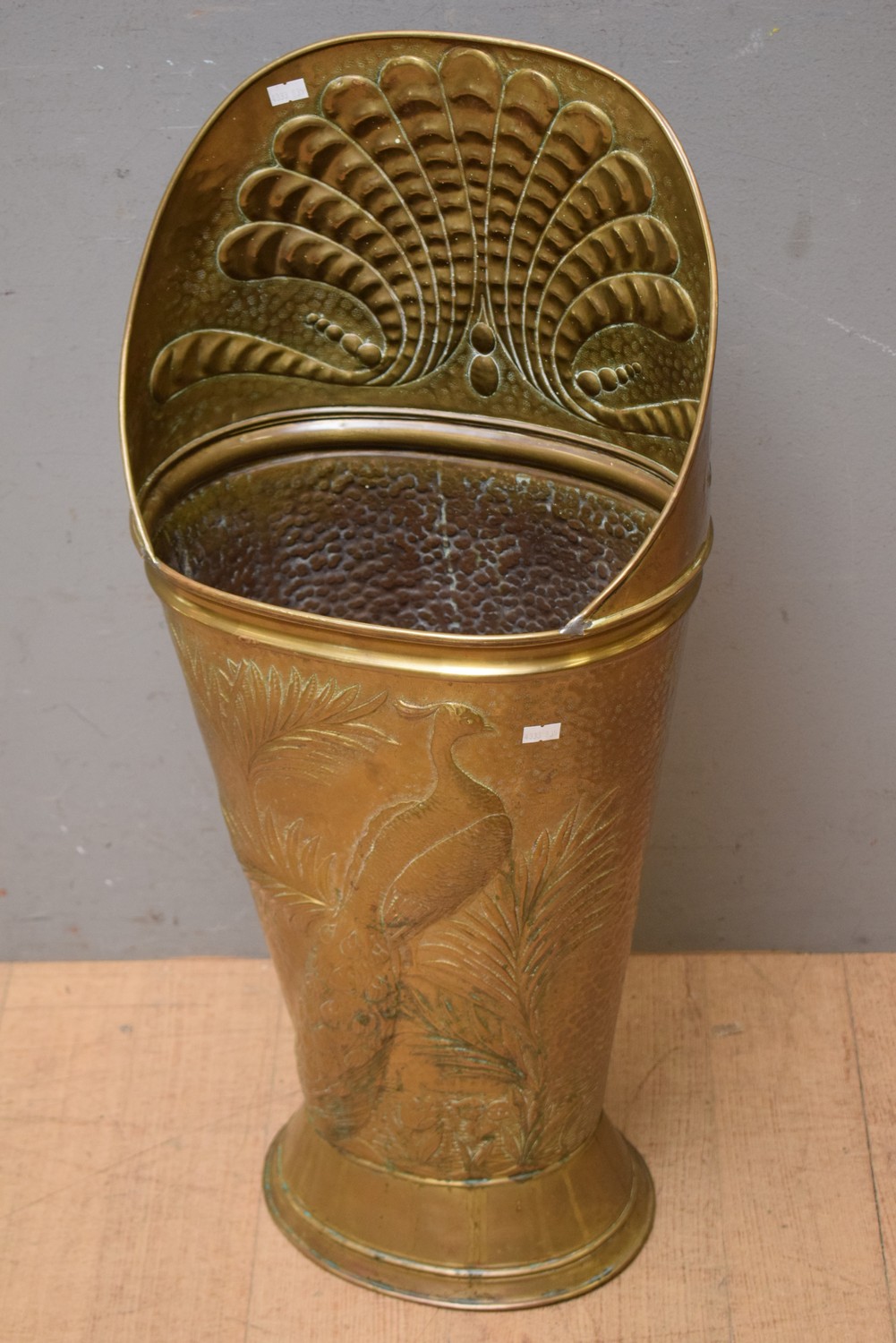 A FRENCH ART NOUVEAU BRASS PEACOCK DECORATED UMBRELLA/WALKING STICK STAND (H82 CM) (LEONARD JOEL DELIVERY SIZE: MEDIUM)