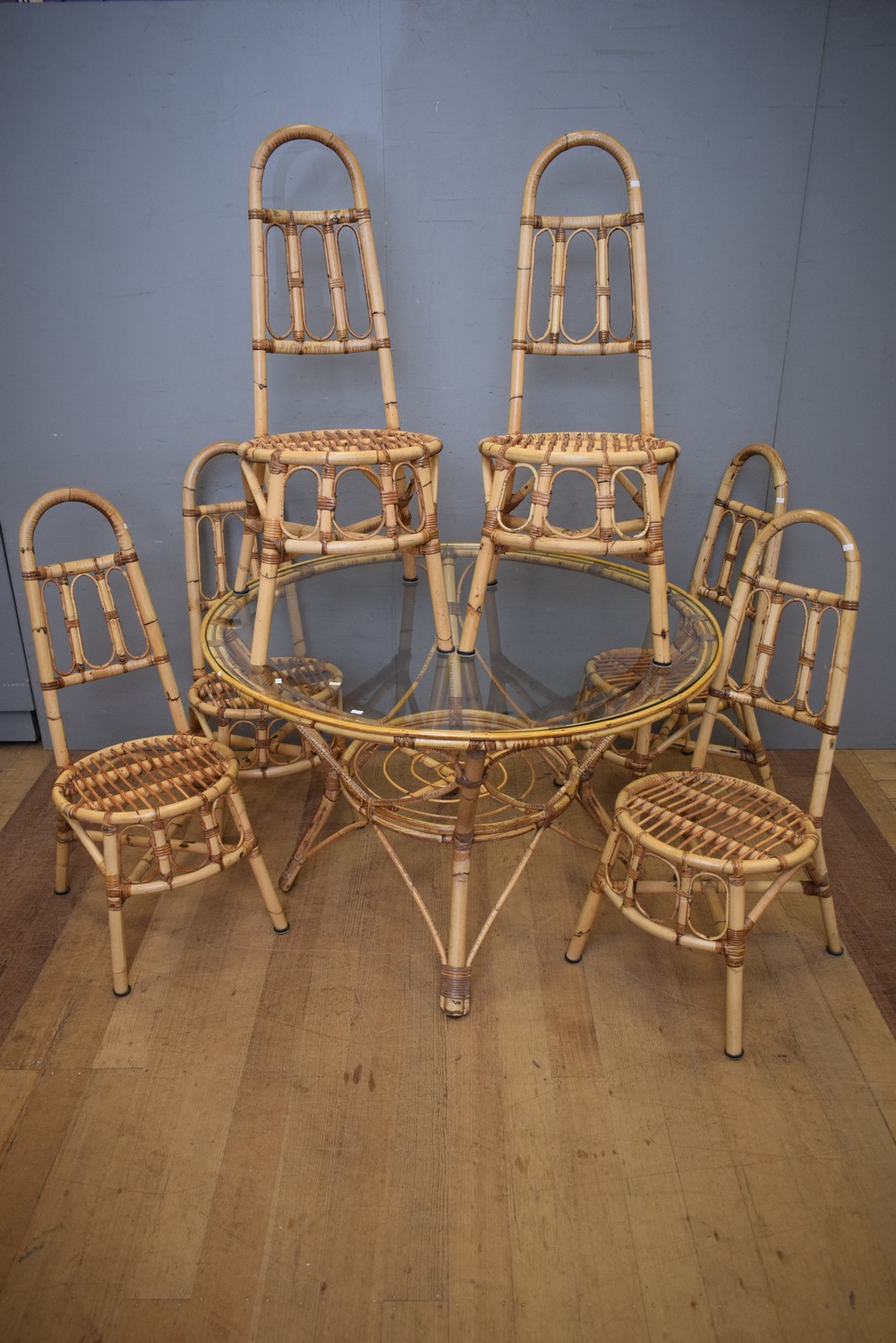 A RETRO AUSTRALIAN 1950S CANE DINING SUITE WITH SIX CHAIRS AND LARGE ROUND TABLE WITH ORIGINAL GLASS TOP (TABLE 76H x 120D CM) (PLEASE NOTE THIS HEAVY ITEM MUST BE REMOVED BY CARRIERS AT THE CUSTOMER'S EXPENSE. LEONARD JOEL STAFF CANNOT ASSIST CARRYING THIS ITEM) (X-LARGE ITEM)