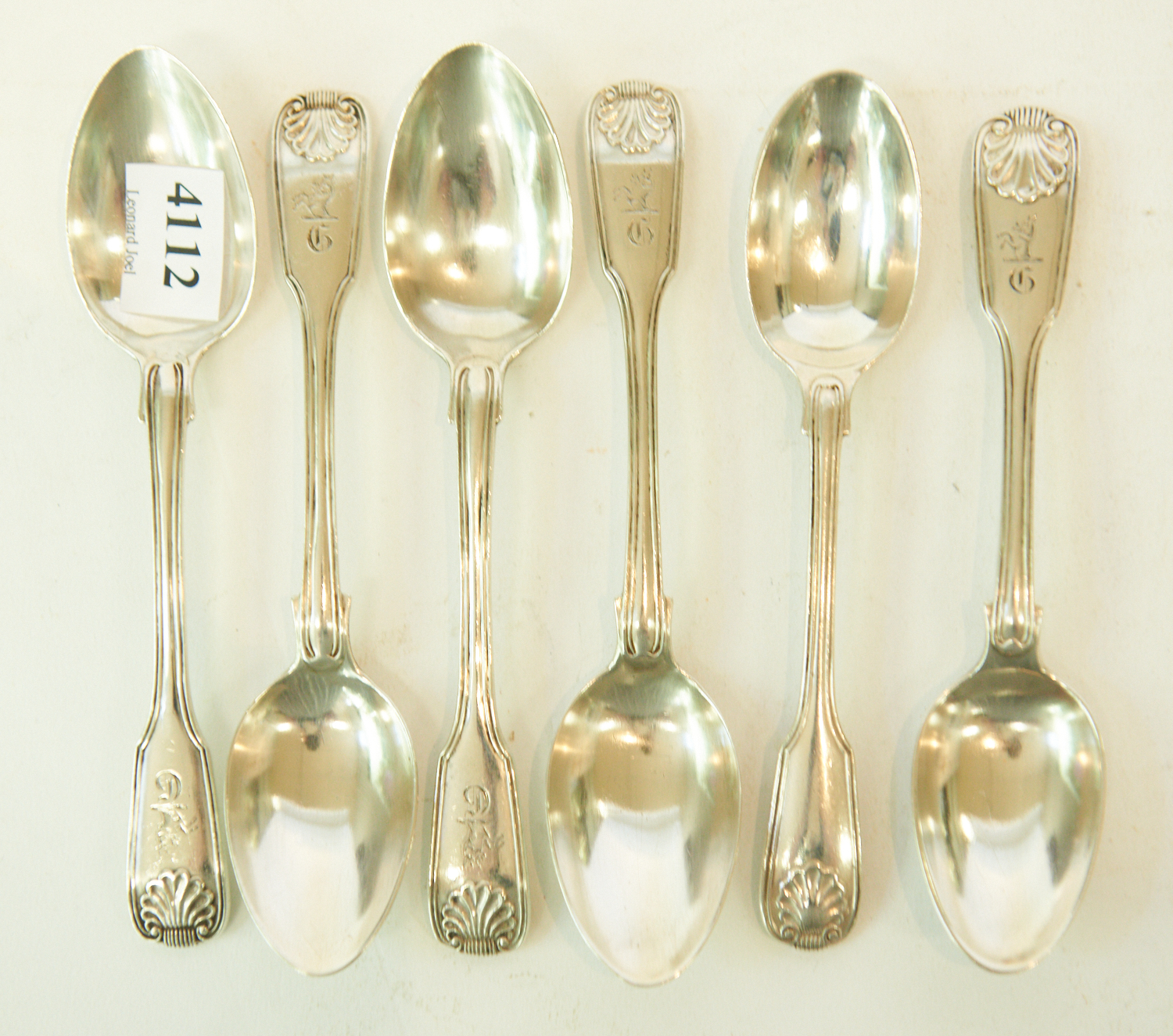 SIX GEORGIAN AND VICTORIAN FIDDLE THREAD AND SHELL STERLING SILVER TEASPOONS, LEONARD JOEL LOCAL DELIVERY SIZE: SMALL