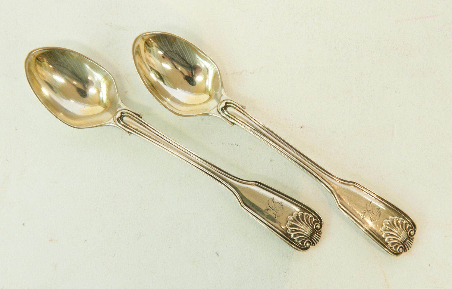 A PAIR OF VICTORIAN FIDDLE THREAD AND SHELL STERLING SILVER EGG SPOONS, LEONARD JOEL LOCAL DELIVERY SIZE: SMALL
