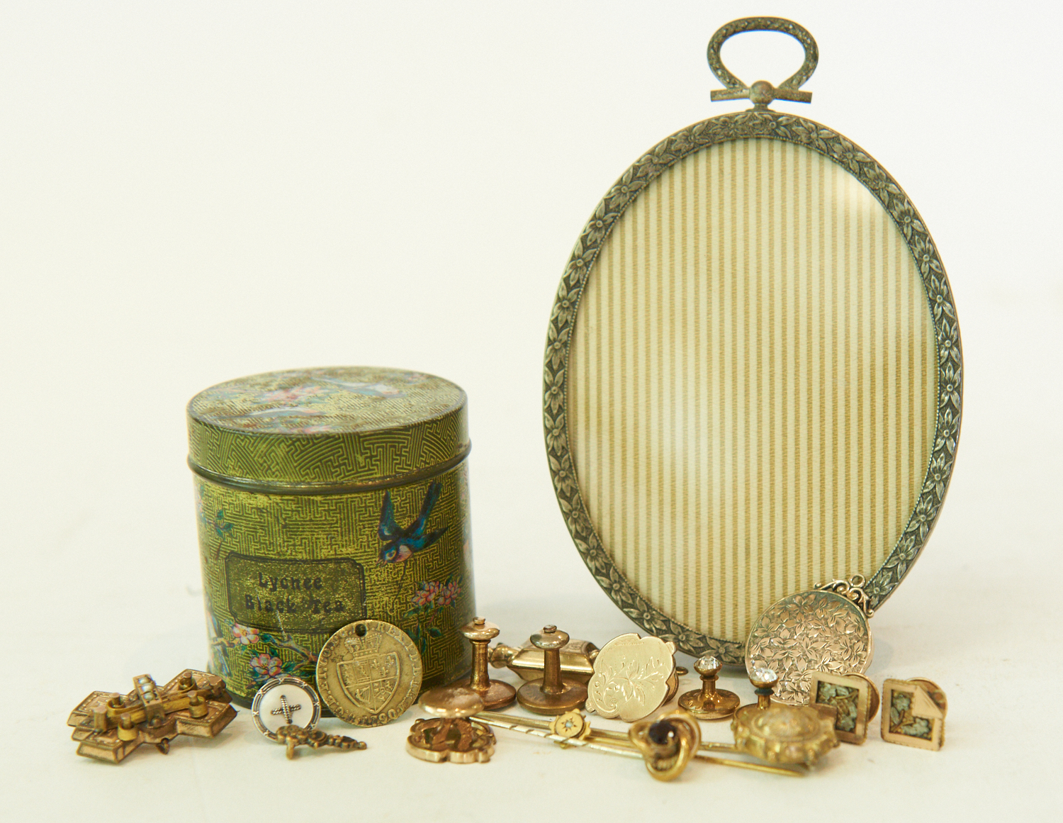 A SILVER METAL FRAME, SMALL TIN AND A COLLETION OF TIE PINS, STUDS AND CUFFLINKS, LEONARD JOEL LOCAL DELIVERY SIZE: SMALL