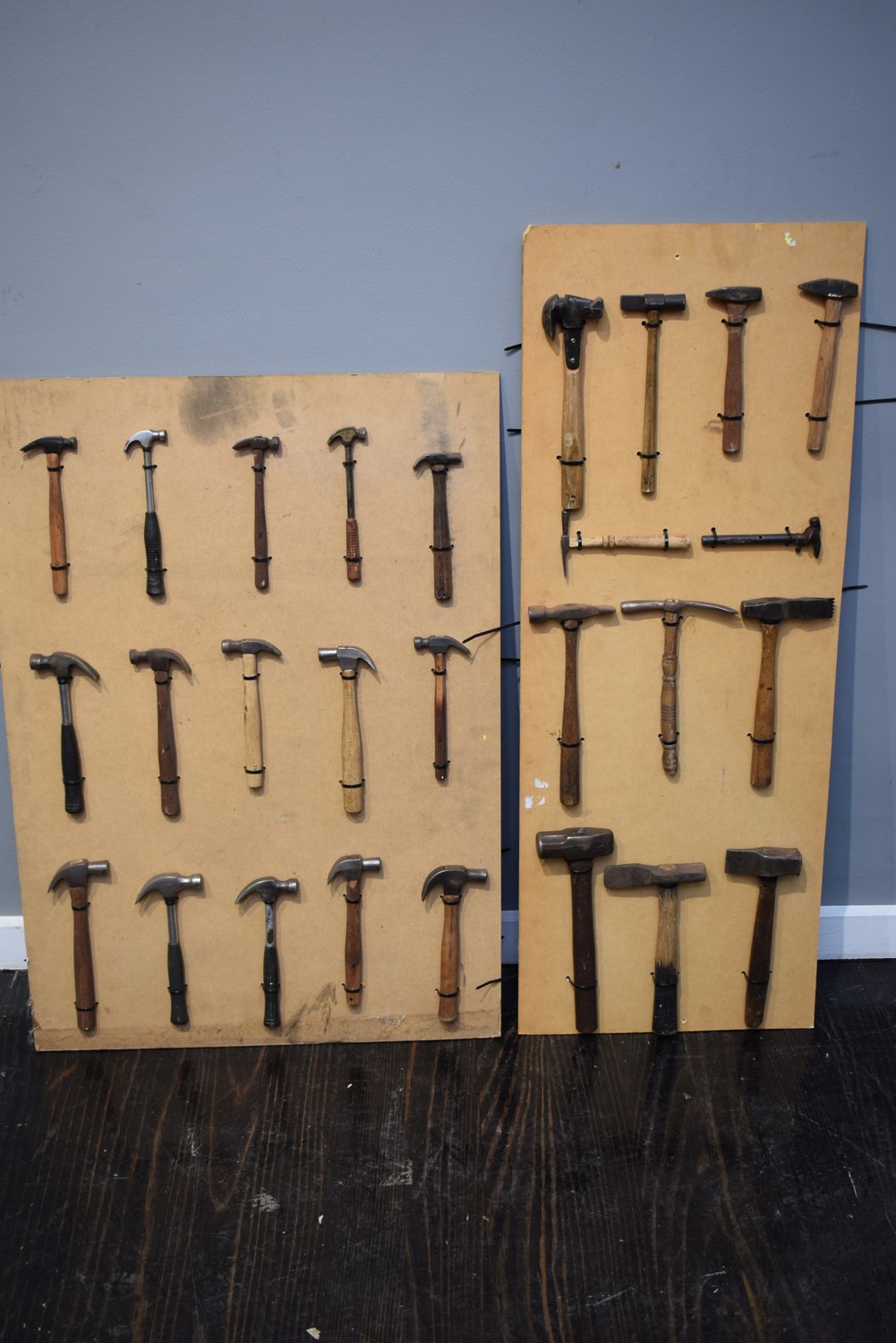 A COLLECTION 27 OF VINTAGE HAMMERS AND TOOLS MOUNTED ON TWO BOARDS (A/F) (LARGER 72H X 102W CM)