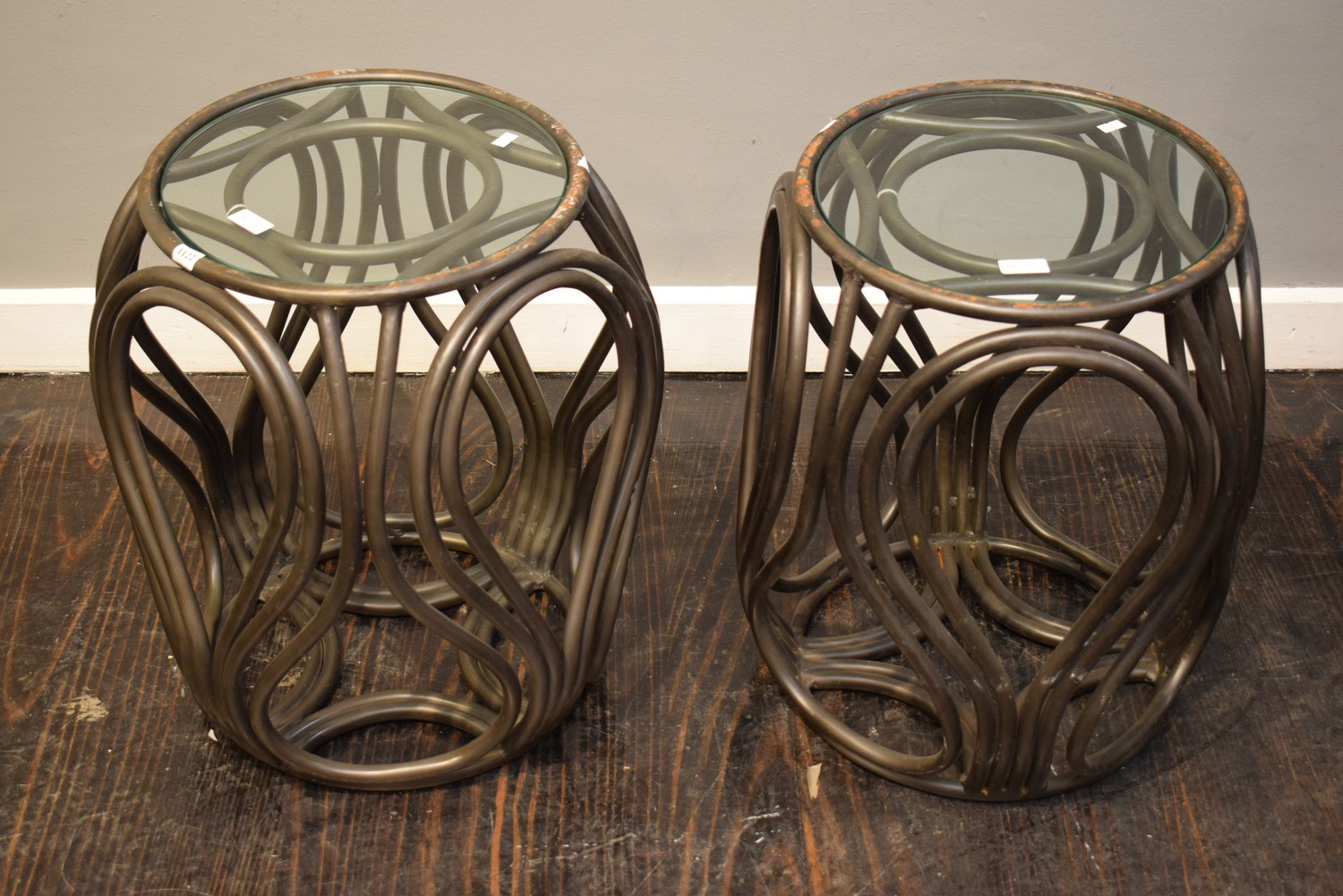 A PAIR OF GREY METAL BENTWOOD STYLE SIDETABLES WITH GLASS TOPS (53H X 40W X 40D CM) (A/F)