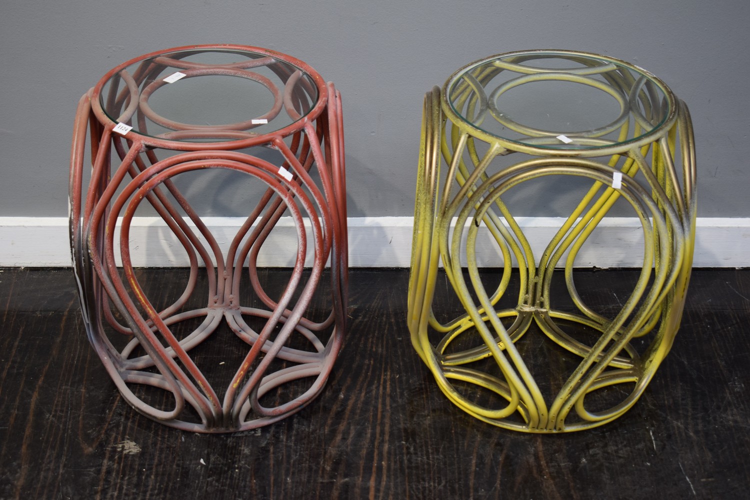 TWO METAL BENTWOOD STYLE SIDETABLES WITH GLASS TOPS IN YELLOW AND RED (53H X 40W X 40D CM) (A/F)