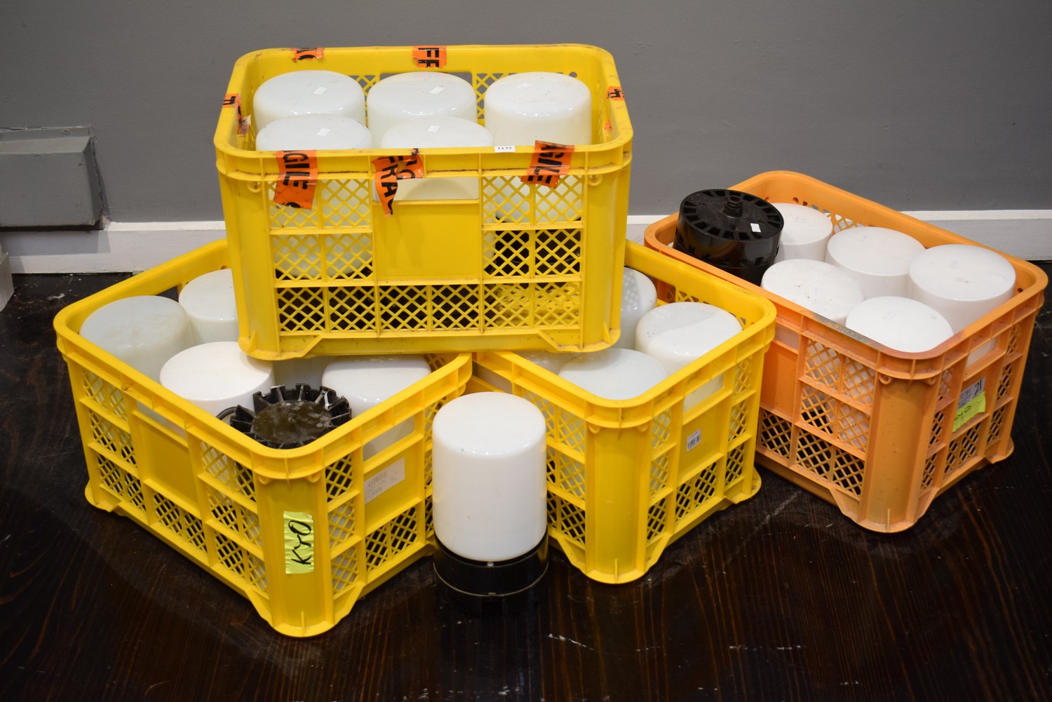 TWENTY FOUR GLASS SHADE LIGHTS IN FOUR CRATES (A/F, UNTESTED) (LIGHTS 28H X 15D CM)