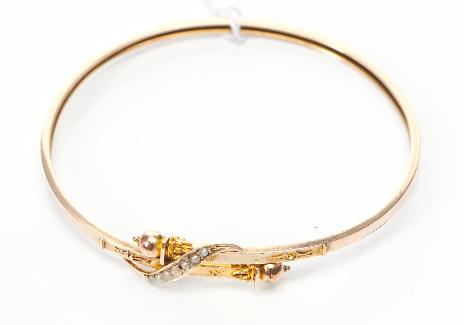 AN EDWARDIAN CROSSOVER BANGLE WITH SEED PEARL DETAILS, IN ___ GOLD, 6GMS