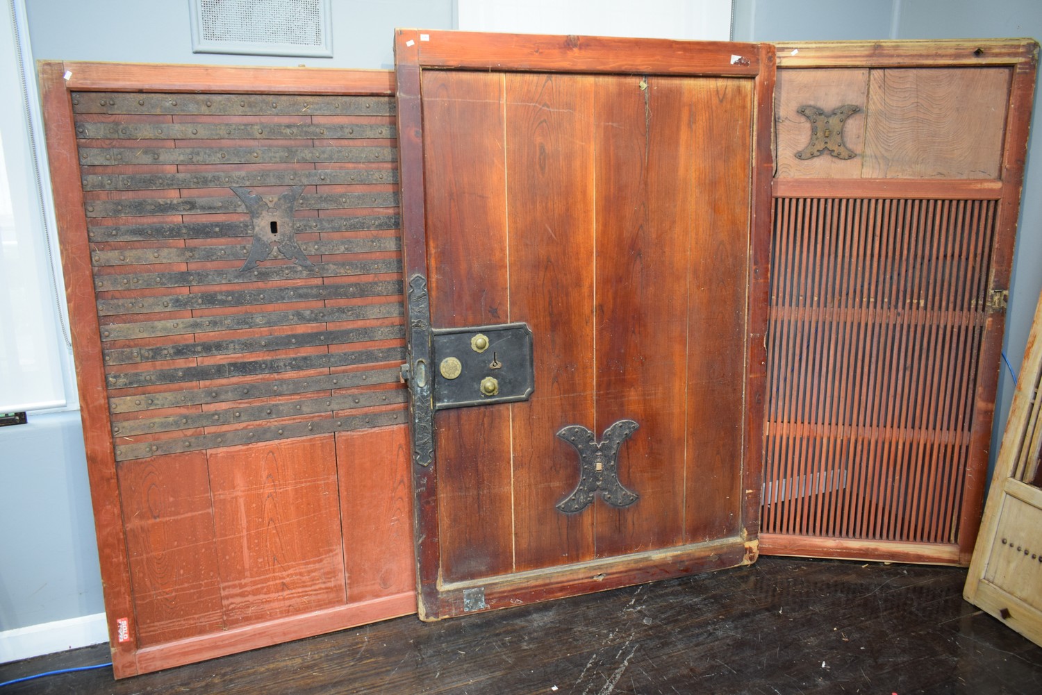 THREE LARGE JAPANESE IRON BOUND WOODEN DOORS (A/F) (192H X 132W CM)