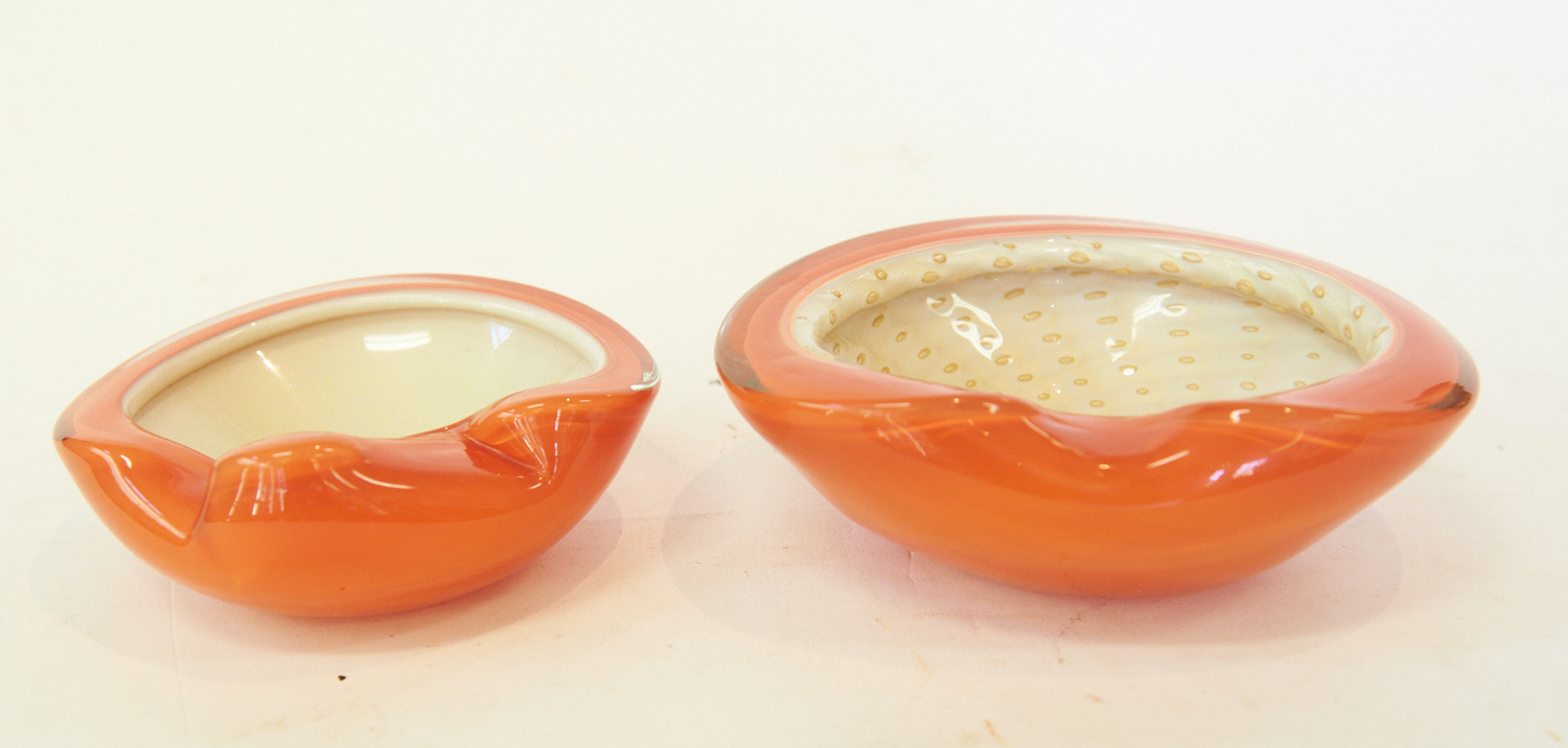 TWO CASED MURANO GLASS DISHES IN SHADES OF ORANGE WITH GOLD INCLUSIONS W.20CM, LEONARD JOEL LOCAL DELIVERY SIZE: SMALL