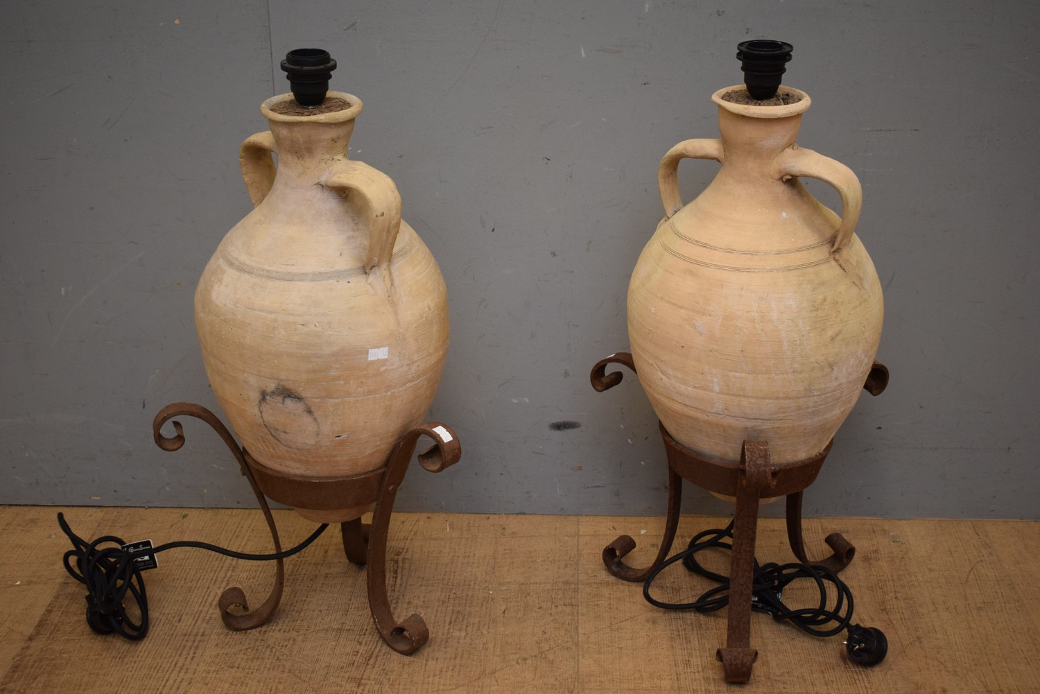 A PAIR OF MOUNTED TERRACOTTA AMPHORA LAMPS (H69 X W30 CM) (LEONARD JOEL DELIVERY SIZE: LARGE)