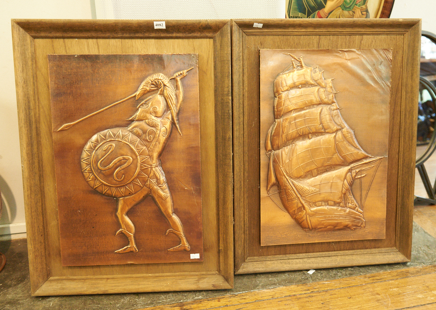A PAIR OF COPPER RELIEF WALL PLAQUES H.65CM, LEONARD JOEL LOCAL DELIVERY SIZE: SMALL