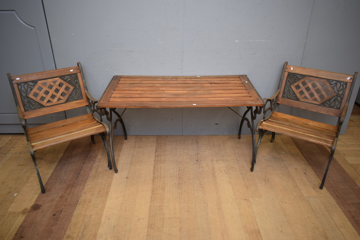 A CAST IRON THREE PIECE OUTDOOR SETTING (TABLE 66H x 125W x 67D CM) (PLEASE NOTE THIS HEAVY ITEM MUST BE REMOVED BY CARRIERS AT THE CUSTOMER'S EXPENSE. LEONARD JOEL STAFF CANNOT ASSIST CARRYING THIS ITEM) (X-LARGE ITEM)