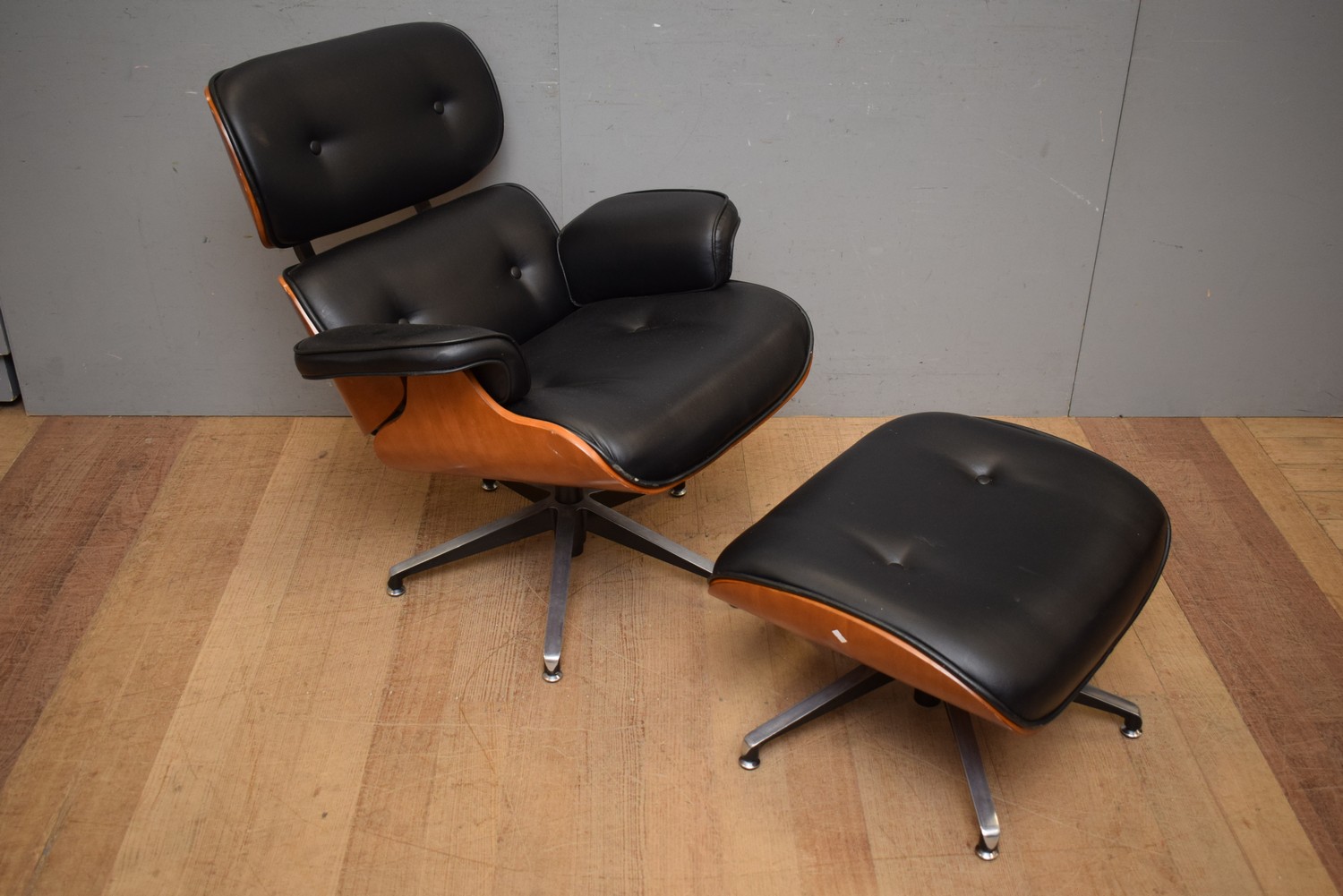 AN EAMES STYLE ARMCHAIR WITH MATCHING OTTOMAN (A/F) (88H x 79W x 94D CM) (LEONARD JOEL DELIVERY SIZE: LARGE)