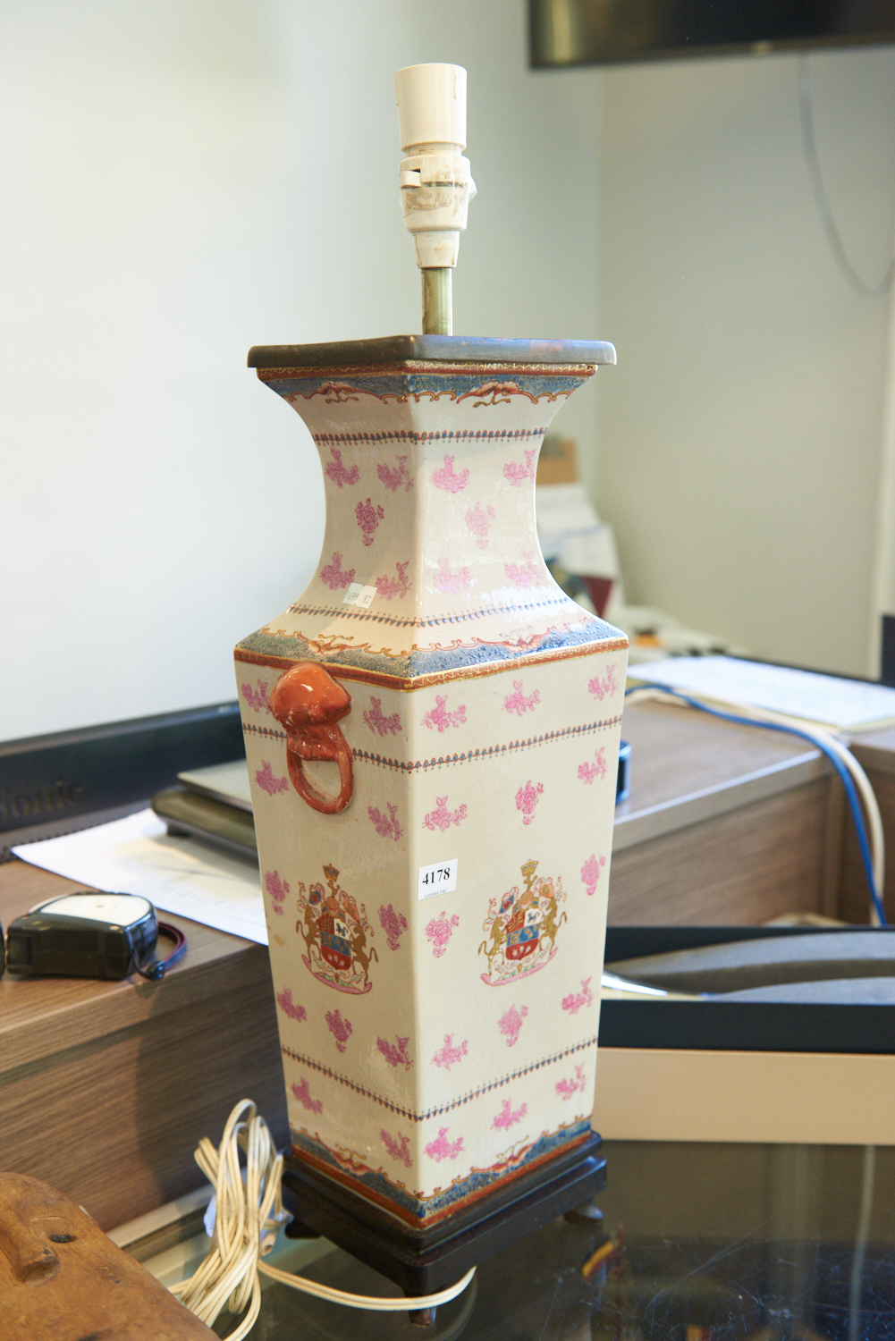 A PORCELAIN LAMP BASE WITH ARMORIAL CREST DECORATION (85 CM H), LEONARD JOEL LOCAL DELIVERY SIZE: SMALL
