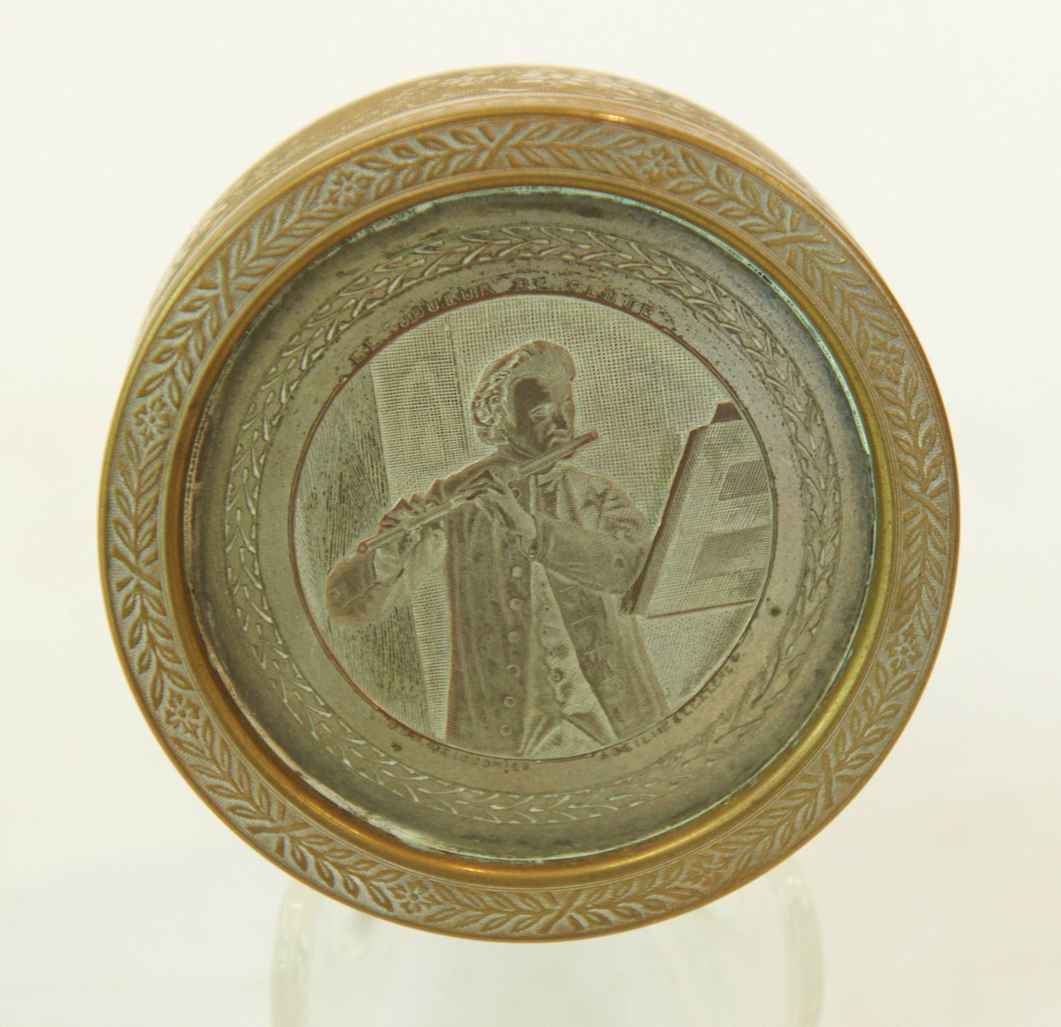 A ROUND EMBOSED BRASS BOX, SIGNED 'LE JOUEUR DE FLUTE' (9 CM D), LEONARD JOEL LOCAL DELIVERY SIZE: SMALL