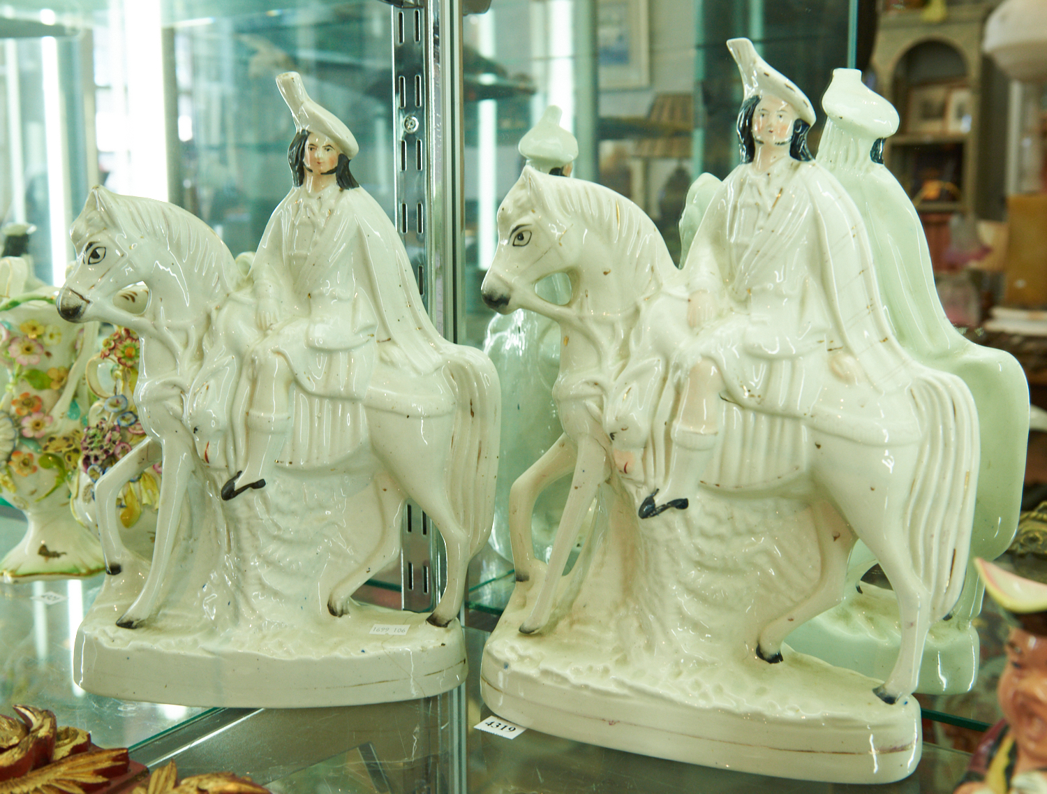 A PAIR OF STAFFORDSHIRE PORCELAIN FIGURES OF MEN ON HORSES (A/F) (36 CM H), LEONARD JOEL LOCAL DELIVERY SIZE: SMALL