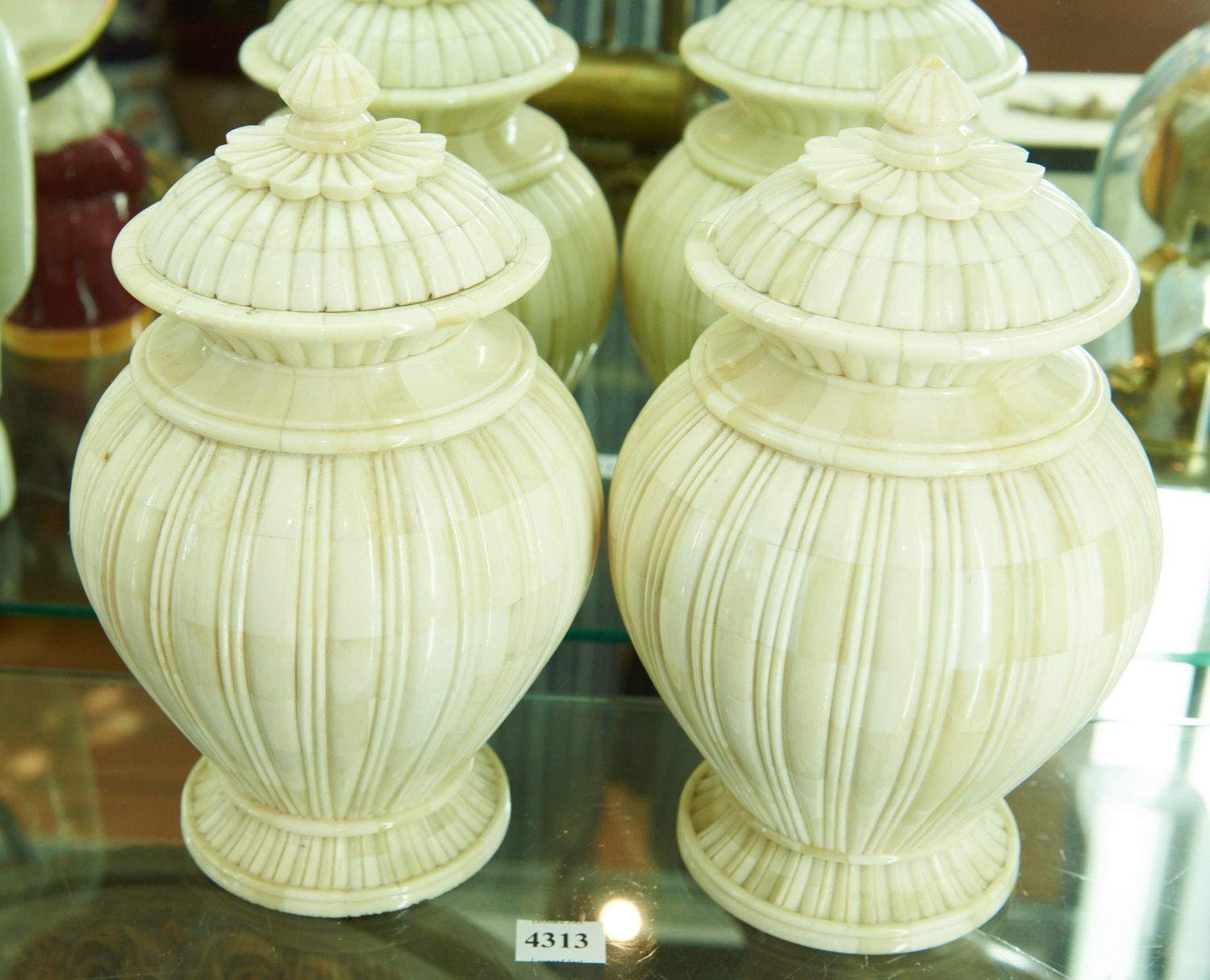 A PAIR OF BONE VENEERED LIDDED URNS (26 CM H), LEONARD JOEL LOCAL DELIVERY SIZE: SMALL