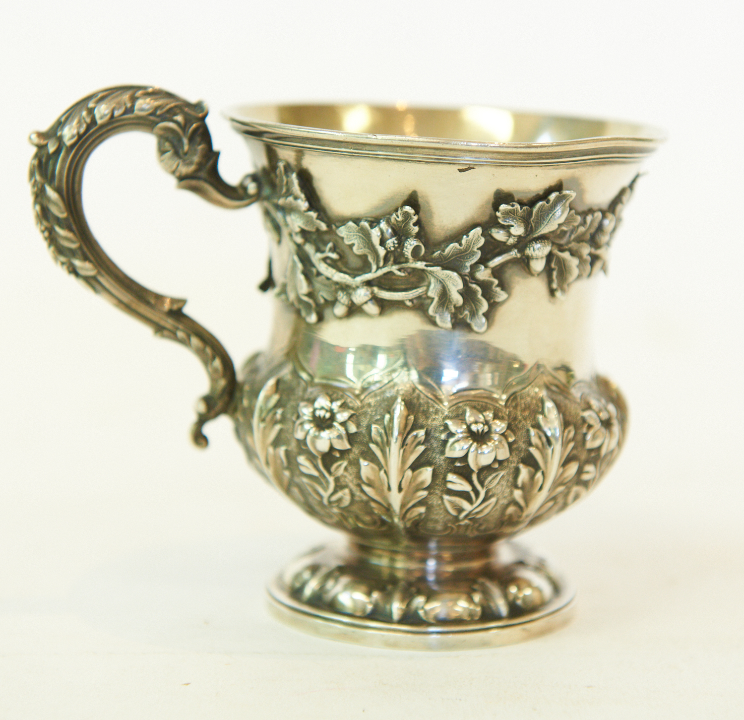 A STERLING SILVER FLORAL EMBOSSED CHRISTENING CUP, 190 G (10 CM H), LEONARD JOEL LOCAL DELIVERY SIZE: SMALL
