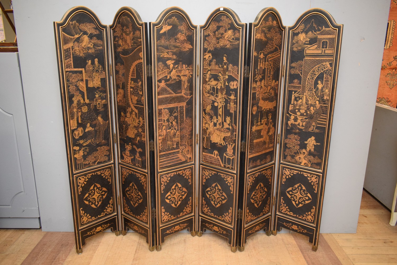 A SIX PANEL DECORATIVELY PAINTED PRIVACY SCREEN (93H x 40W CM PER PANEL) (PLEASE NOTE THIS HEAVY ITEM MUST BE REMOVED BY CARRIERS AT THE CUSTOMER'S EXPENSE. LEONARD JOEL STAFF CANNOT ASSIST CARRYING THIS ITEM) (X-LARGE ITEM)