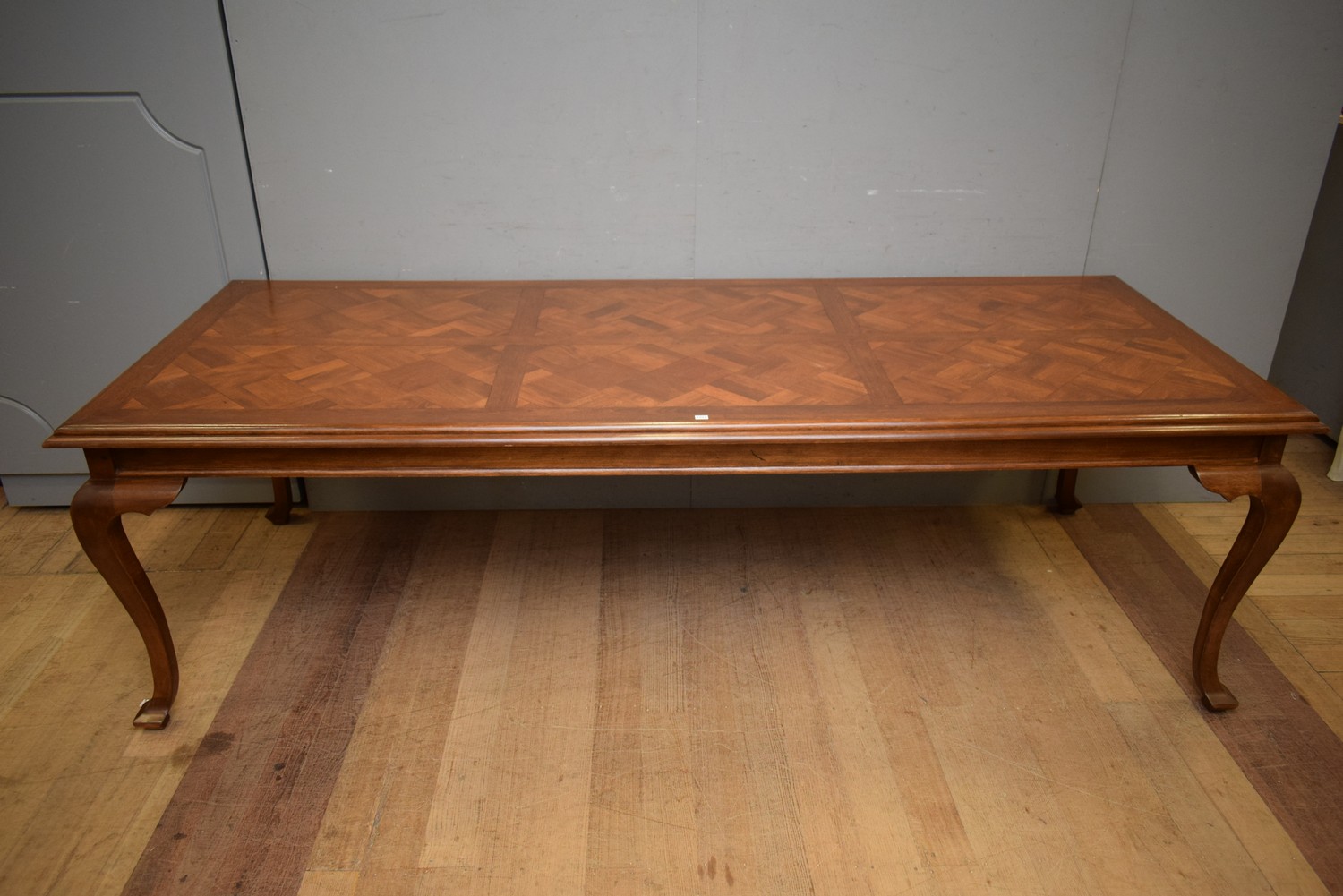 A PARQUETRY TOP FARMHOUSE STYLE DINING TABLE (76H x 250W x 100D CM) (PLEASE NOTE THIS HEAVY ITEM MUST BE REMOVED BY CARRIERS AT THE CUSTOMER'S EXPENSE. LEONARD JOEL STAFF CANNOT ASSIST CARRYING THIS ITEM) (X-LARGE ITEM)