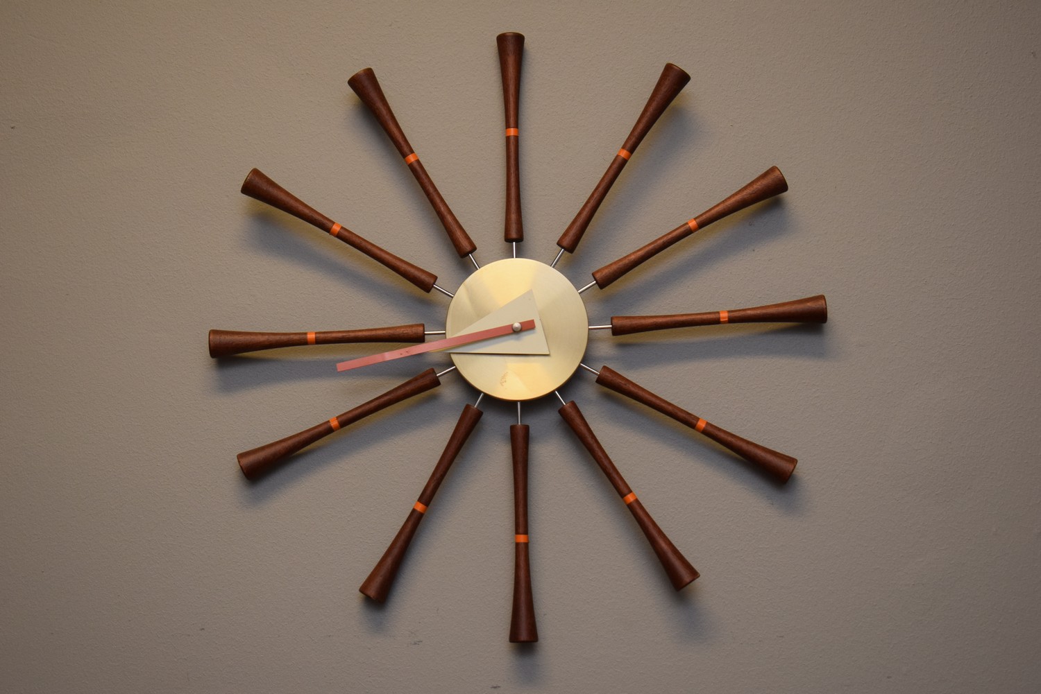 A MID CENTURY CLOCK (WORKING) (A/F) (51D CM) (LEONARD JOEL DELIVERY SIZE: SMALL)