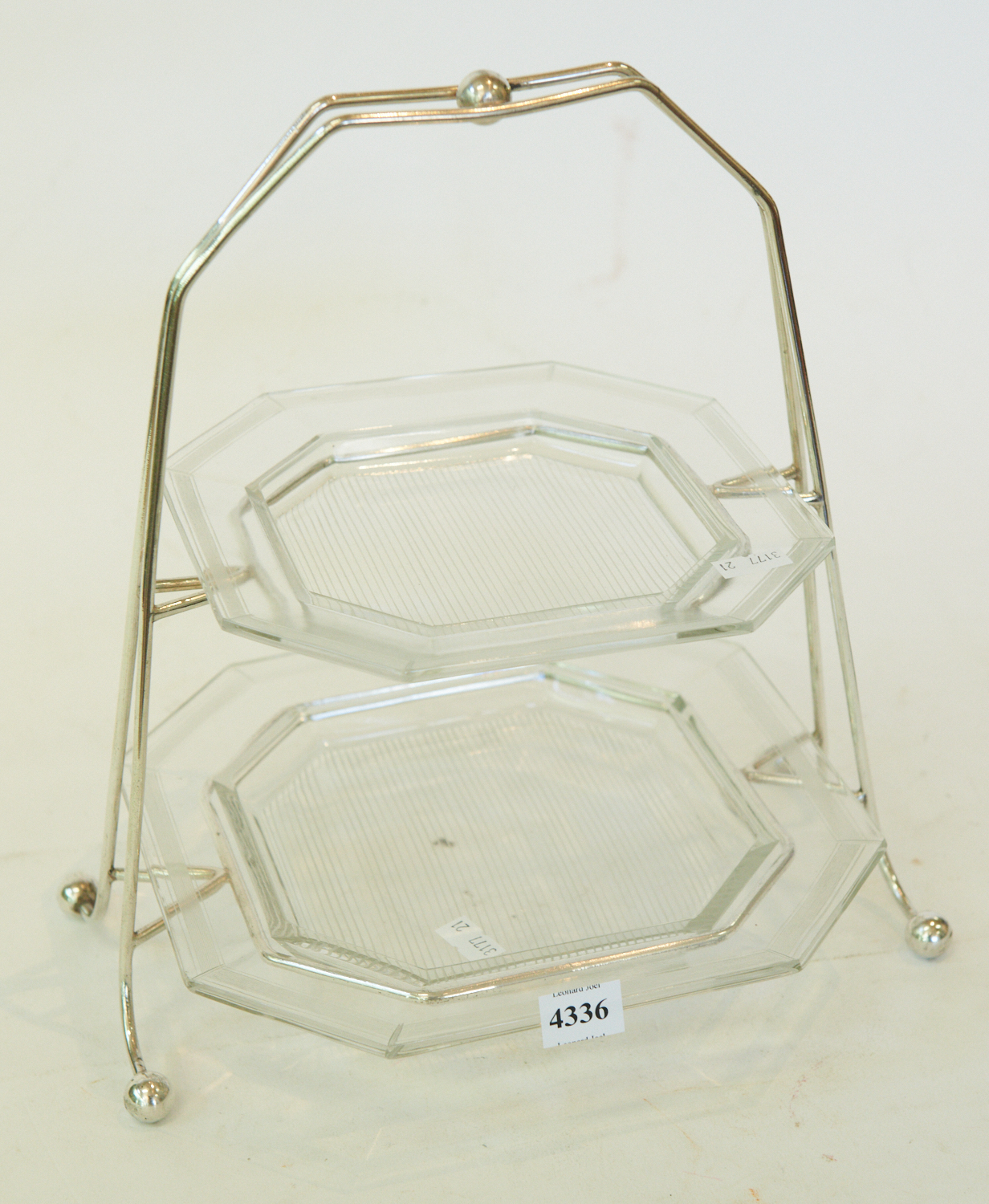AN ART DECO SILVER PLATE TWO TIER CAKE SERVING STAND WITH OCTAGONAL GLASS PLATES, LEONARD JOEL LOCAL DELIVERY SIZE: SMALL