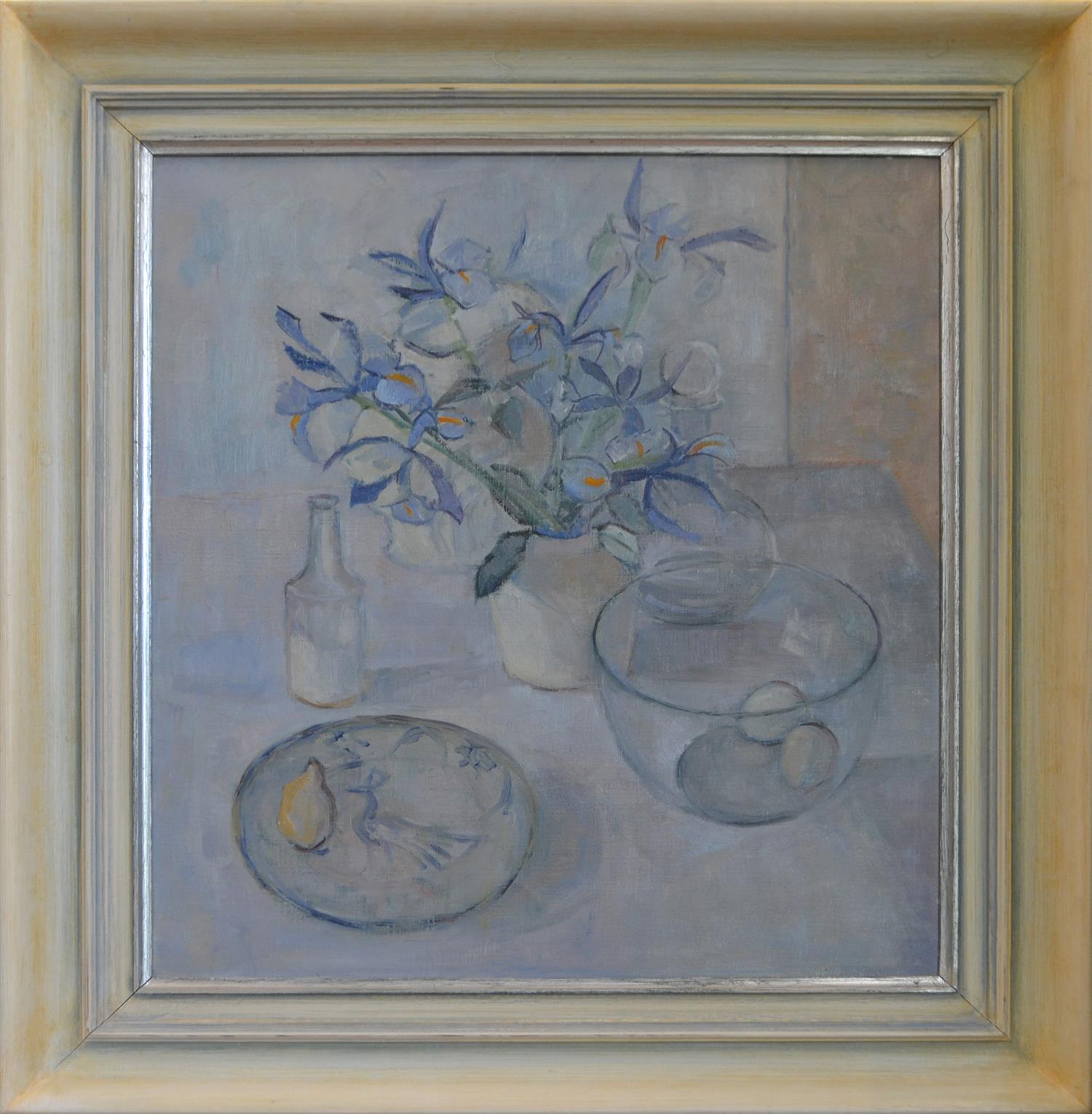 JUNE MILES, IRIS STILL LIFE, OIL ON CANVAS, 50 X 45CM, LEONARD JOEL DELIVERY SIZE: MEDIUM