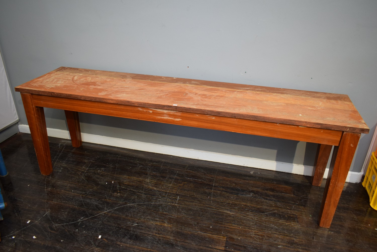 A SUBSTANTIAL HARDWOOD CONSOLE TABLE (A/F) (78H x 236W x 55D CM) (PLEASE NOTE THIS HEAVY ITEM MUST BE REMOVED BY CARRIERS AT THE CUSTOMER'S EXPENSE. LEONARD JOEL STAFF CANNOT ASSIST CARRYING THIS ITEM) (X-LARGE ITEM)